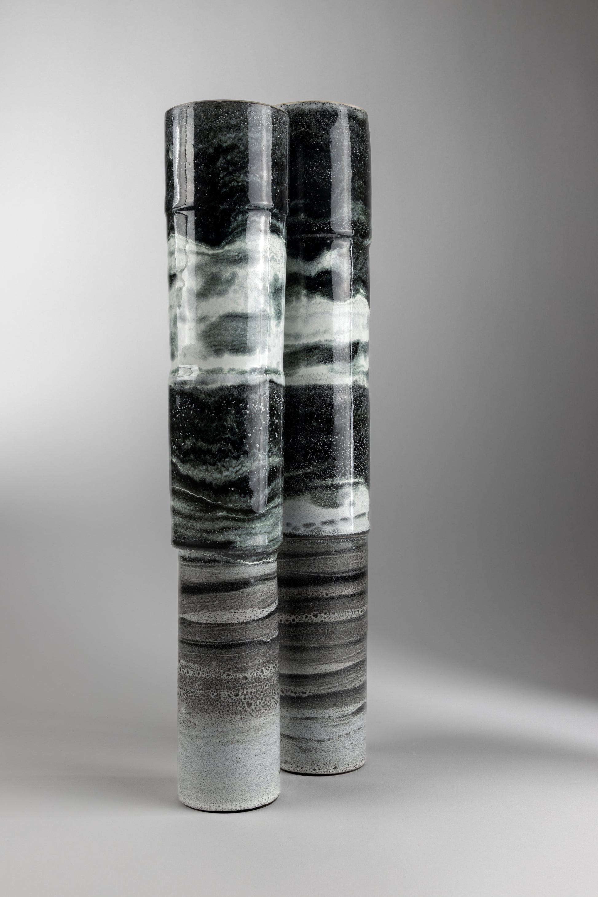 This striking pair of minimal, hand-thrown stoneware vases captures the drama of turbulent waters and brooding skies of Northumberland. From the series 'Black Sky, Black Sea' this pair of vases combined features a distinctive seascape rendered in contrasting black and white glazes, with carefully considered surface finishes. Their bold, minimal form make these pieces compelling sculptural statements, equally at home as a gallery-worthy display or a contemplative addition to a considered interior. A sophisticated pairing that rewards close observation and viewing in the round.