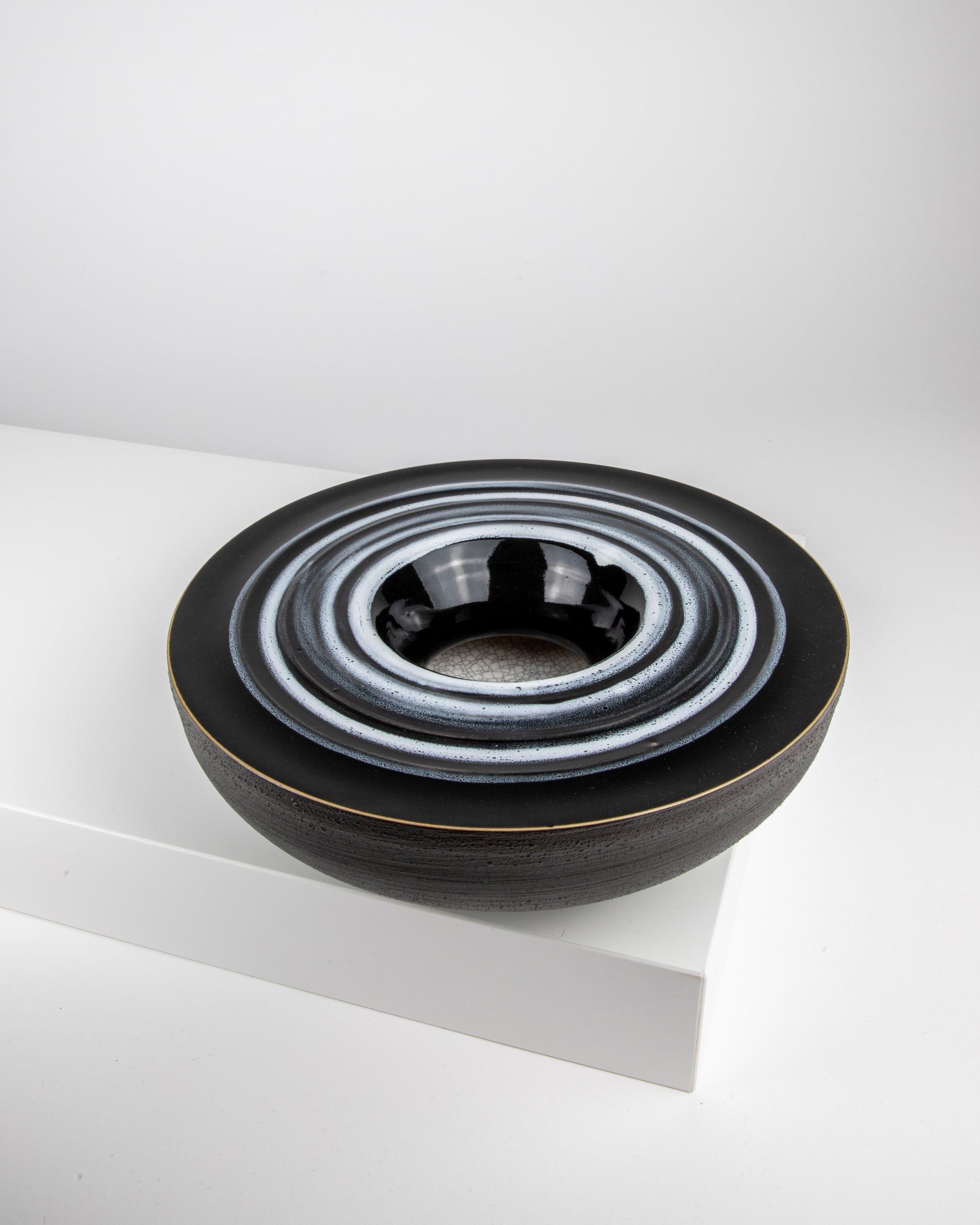 Inspired by the fluid dynamics of rippling water, this ceramic form combines minimalist aesthetics with a sophisticated thrown-form. While a delicately textured black base slip is applied to the outer surface of the piece, the upper surface features a subtly rippled design that draws the eye inward. The plunging opening reveals the inner volume and the inked Kuan crazing glaze applied, creating visual depth. Concentric rings of Kuan glaze layer atop the glossy, reflective rippled surface, enhancing the interplay of light and reflection.