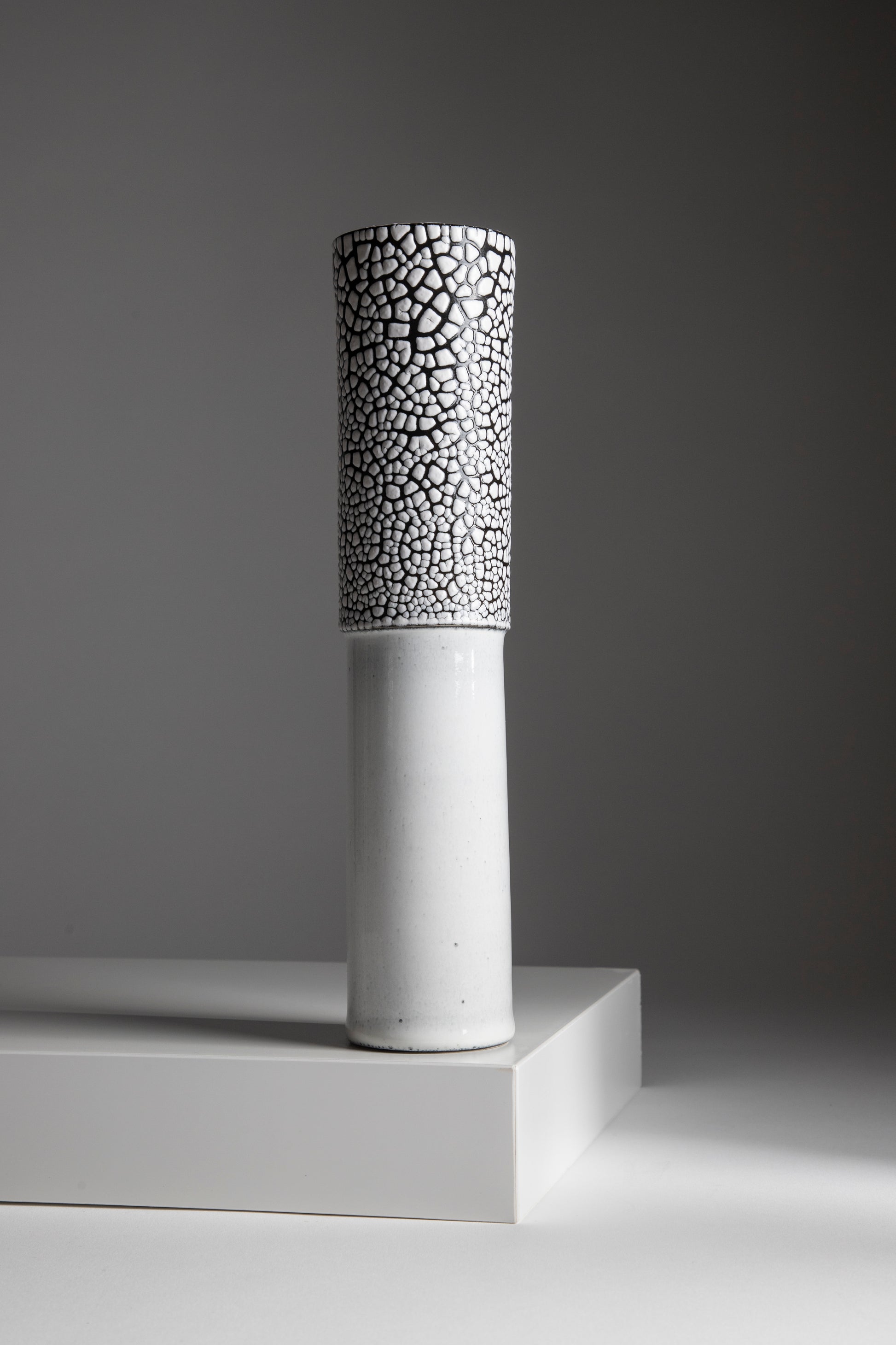 Thrown stoneware column vase featuring multiple layered glazes inspired by the Winter Northumbrian coastline.