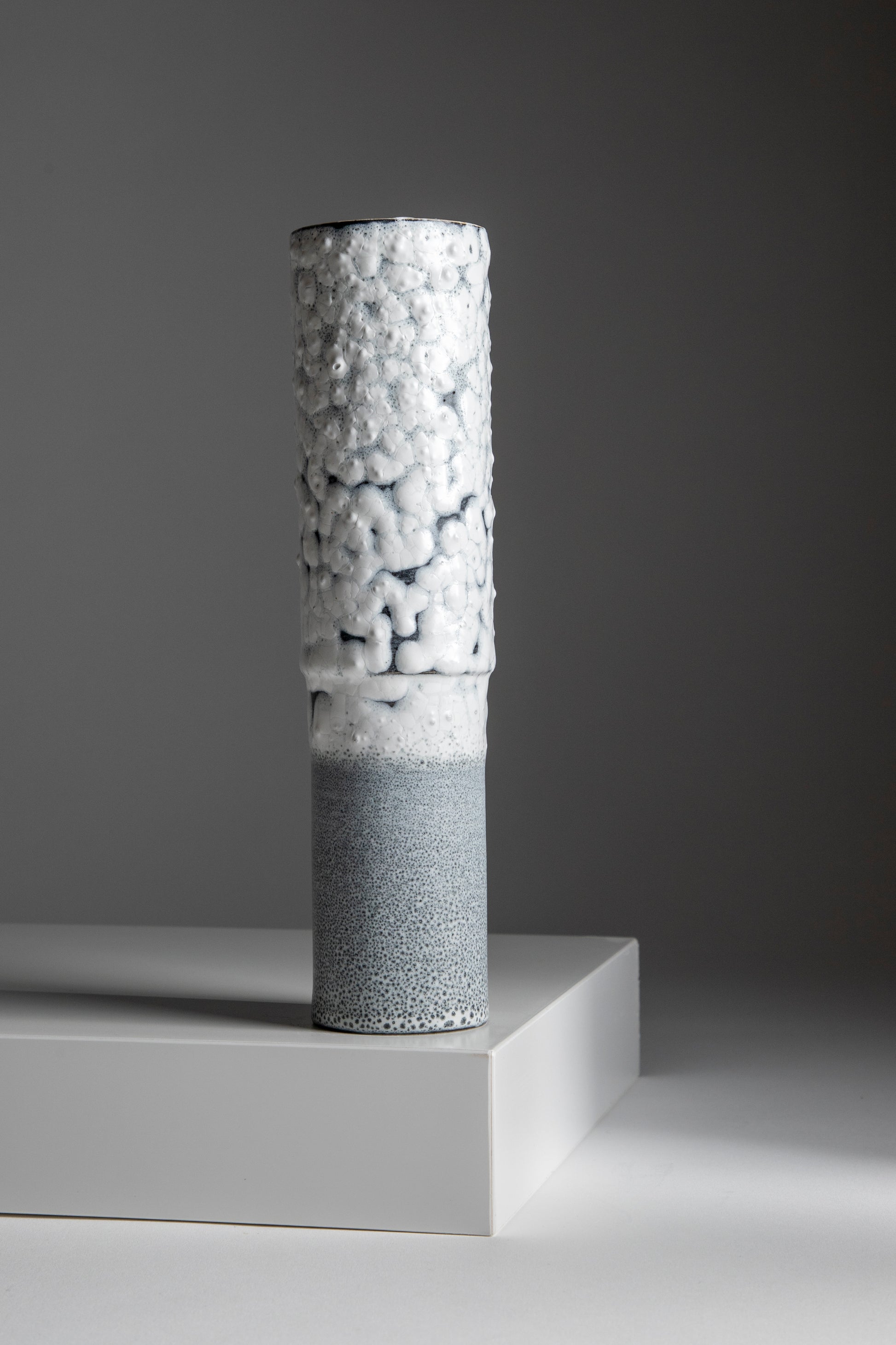 Thrown stoneware column vase featuring multiple layered glazes inspired by the Winter Northumbrian coastline.