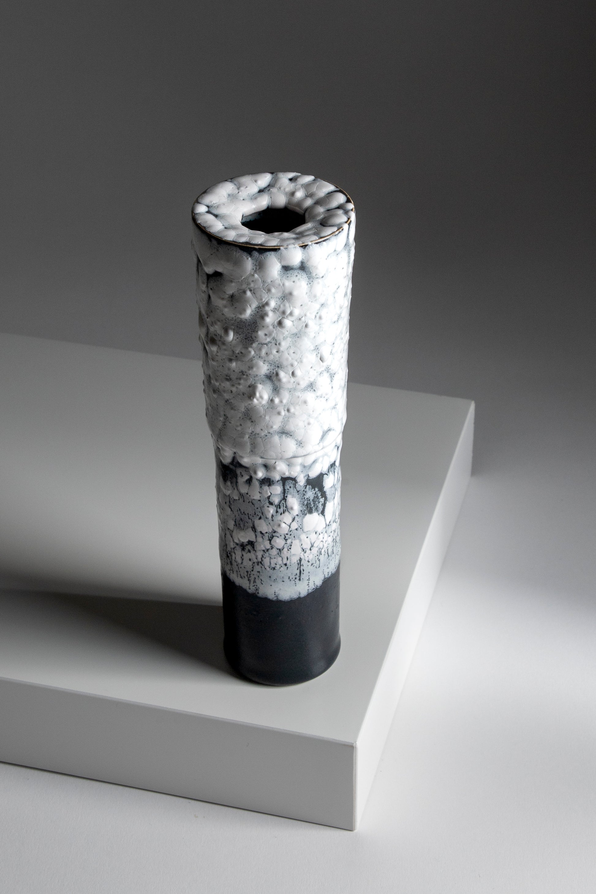 Thrown stoneware column vase featuring multiple layered glazes inspired by the Winter Northumbrian coastline.