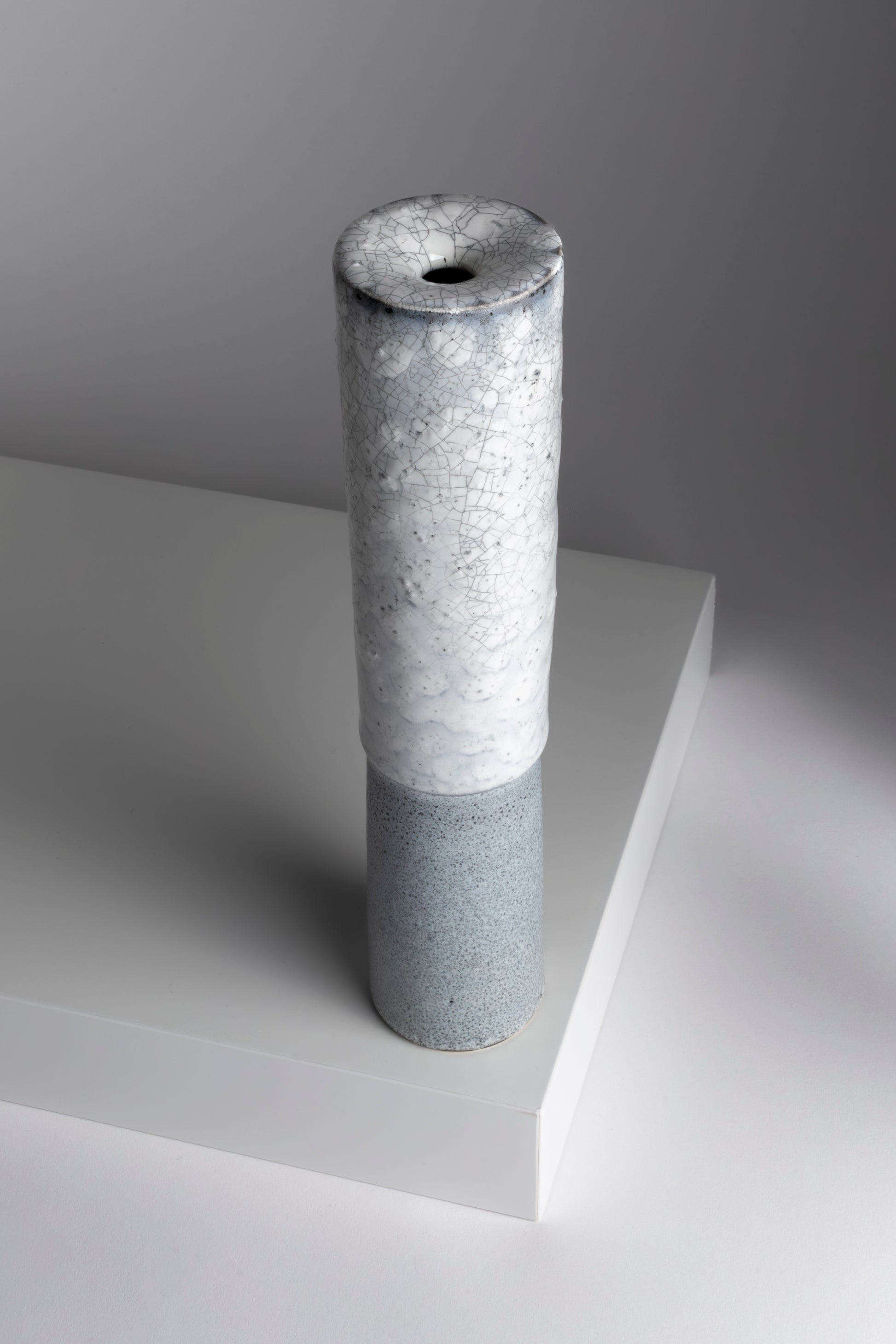 Thrown stoneware column vase featuring multiple layered glazes inspired by the Winter Northumbrian coastline.