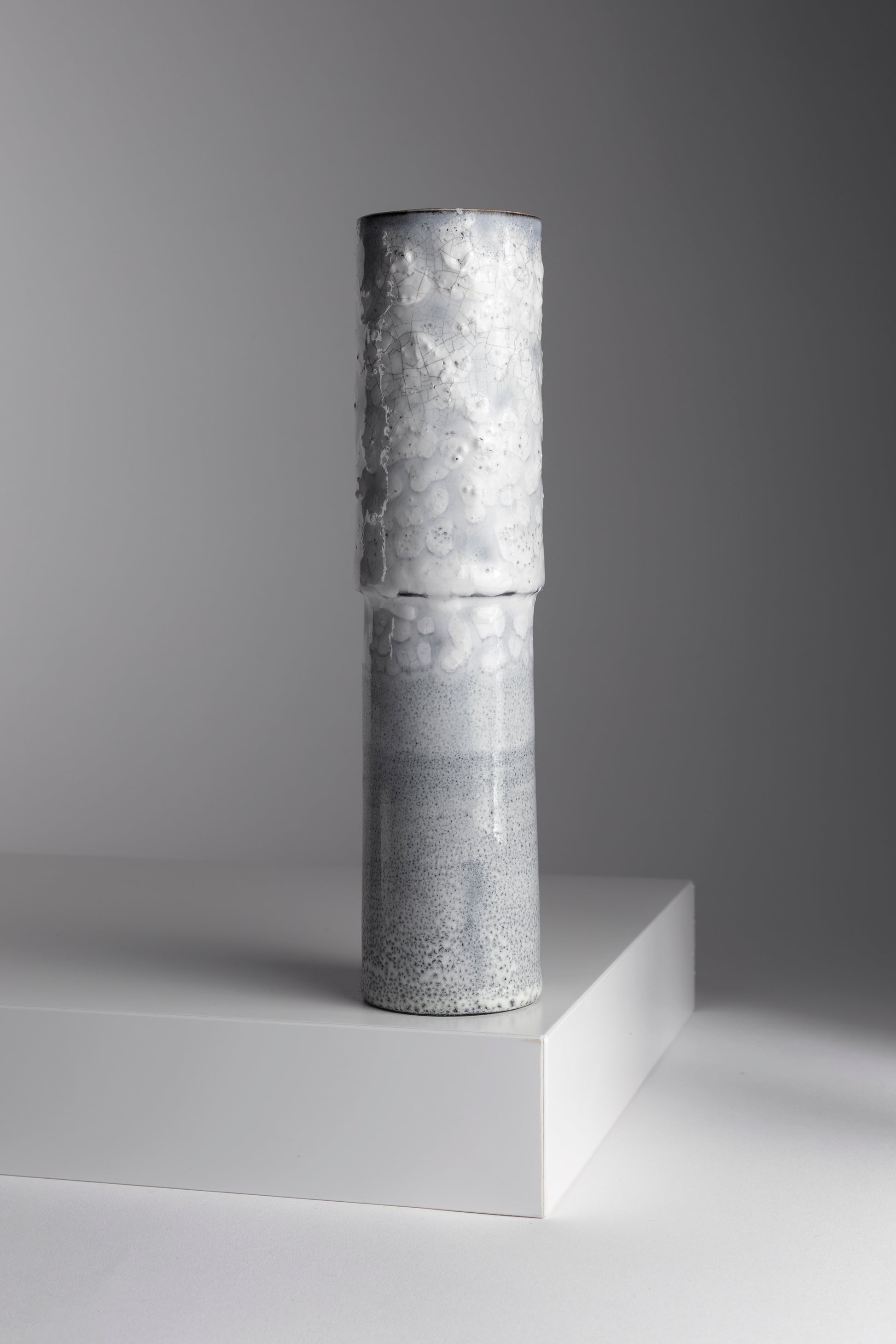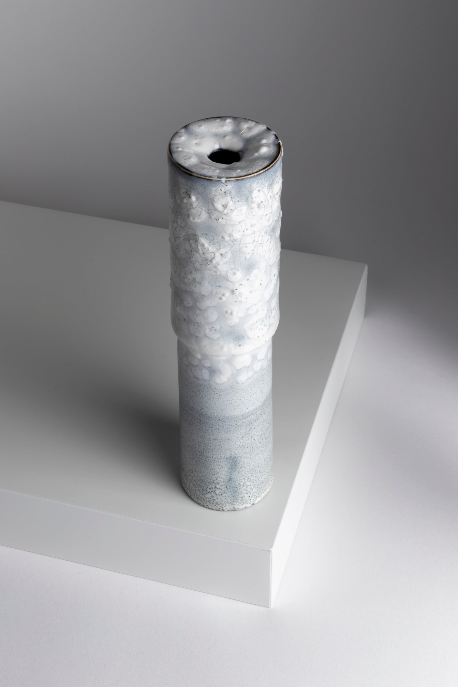 Thrown stoneware column vase featuring multiple layered glazes inspired by the Winter Northumbrian coastline.