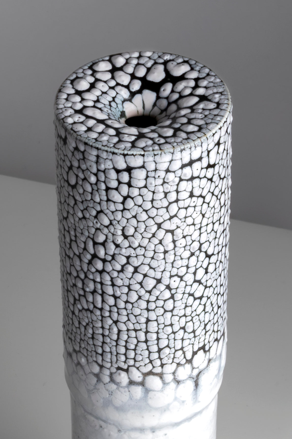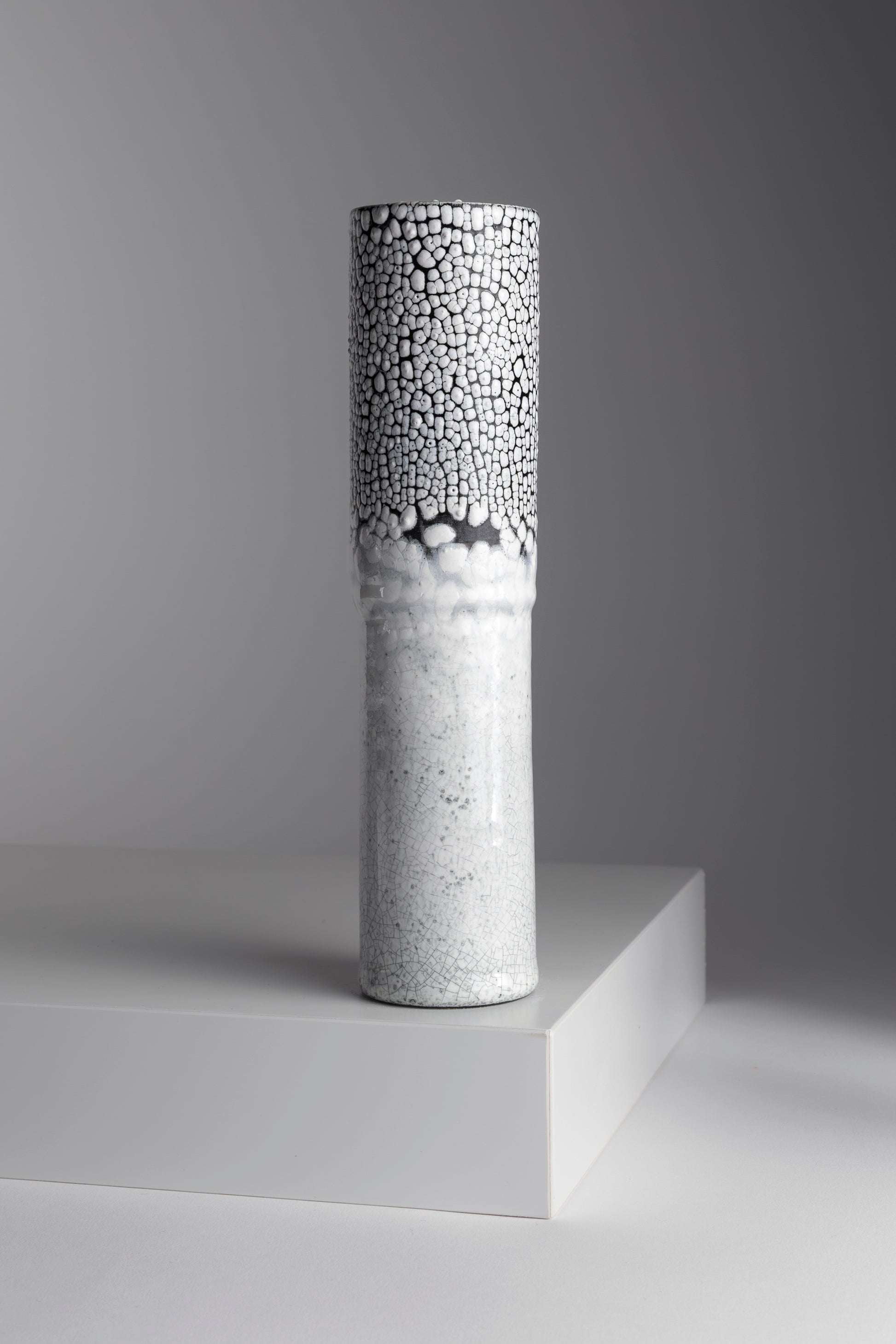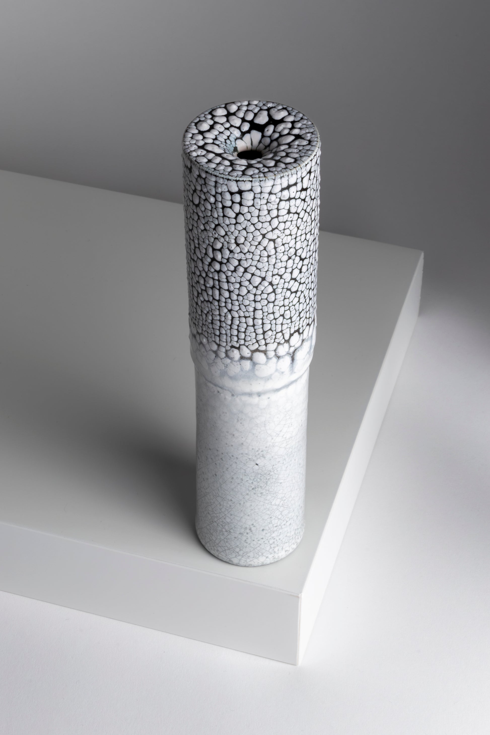 Thrown stoneware column vase featuring multiple layered glazes inspired by the Winter Northumbrian coastline.