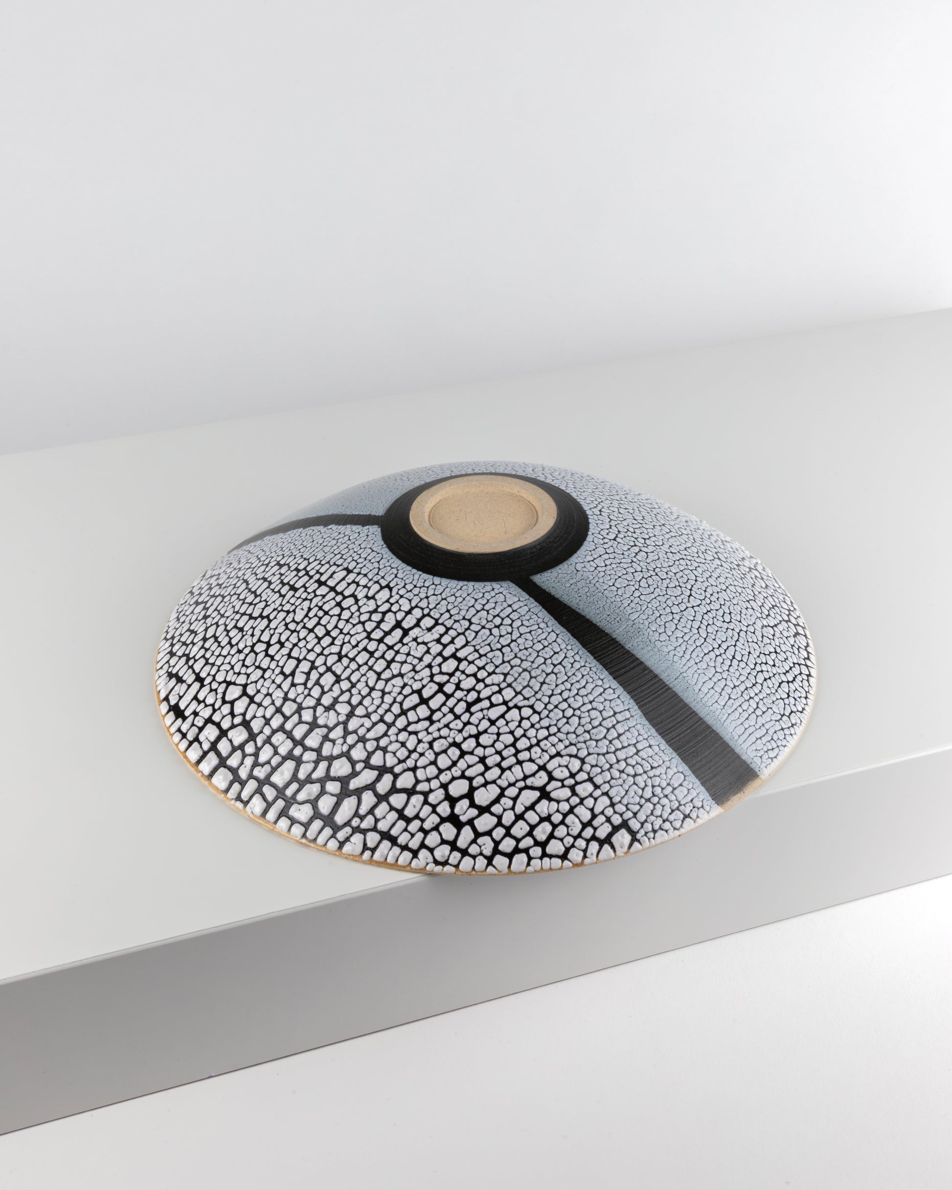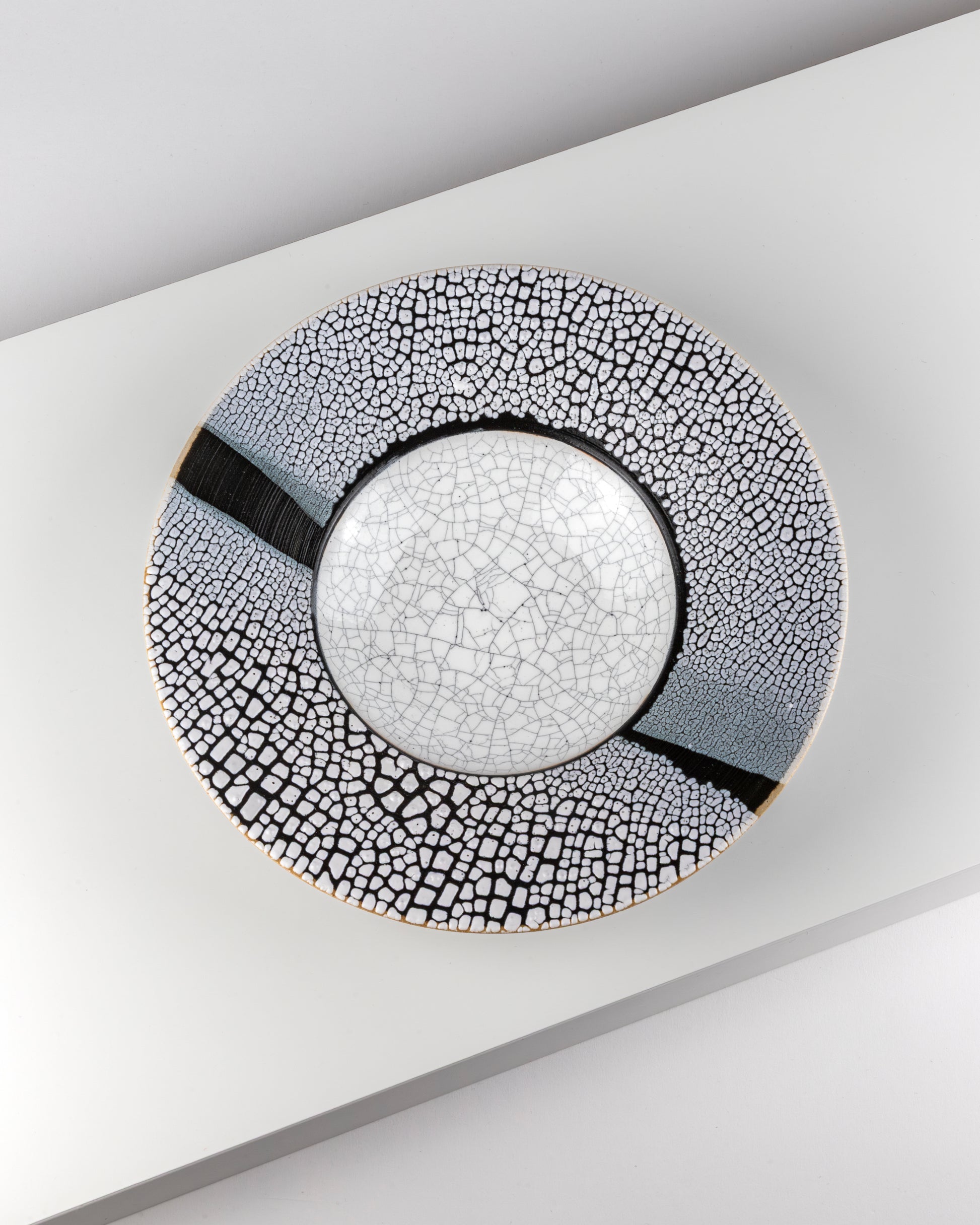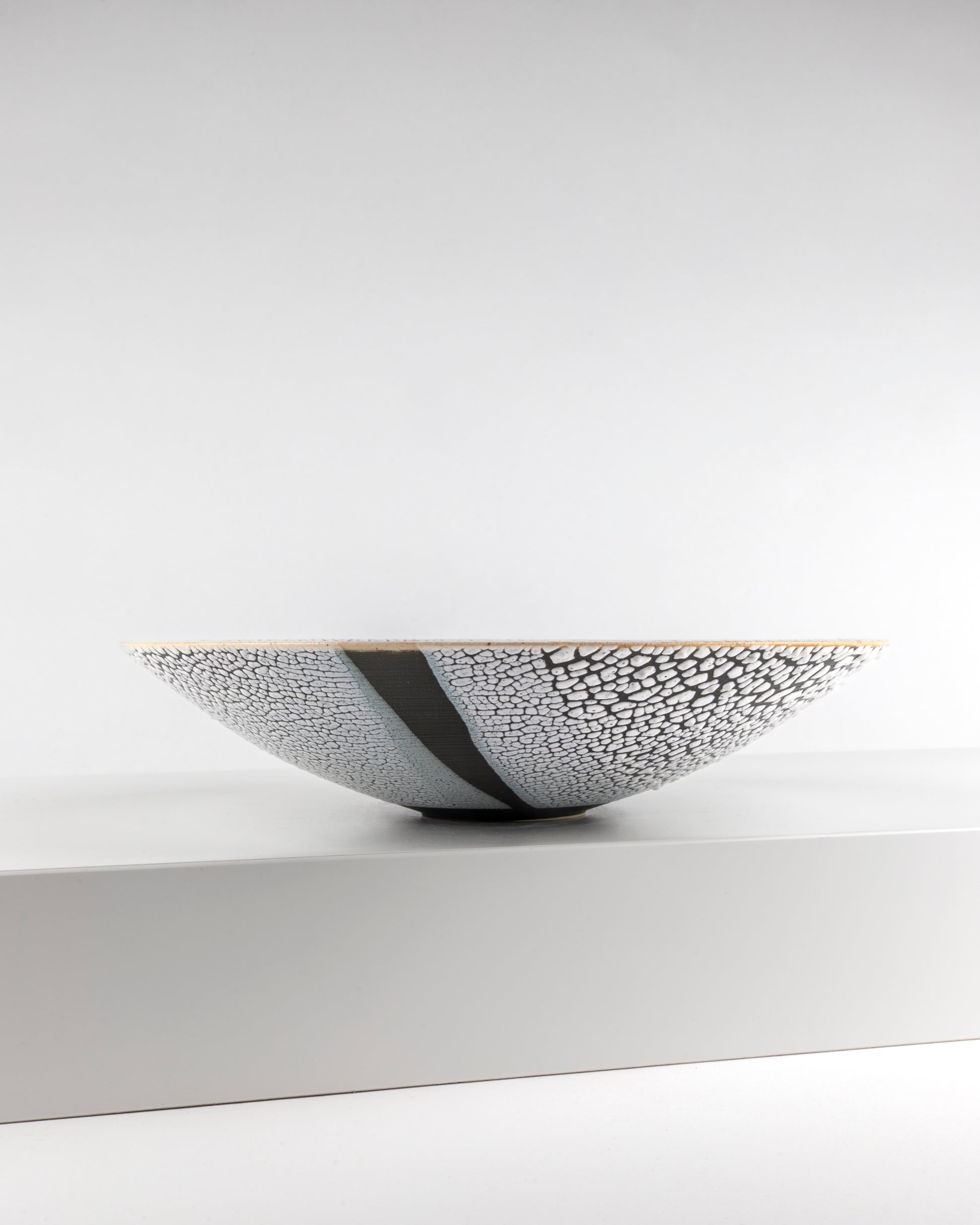 Thrown weighted stoneware Crucible with layered glazes and decorative slips inspired by the Winter Northumbrian coastline.