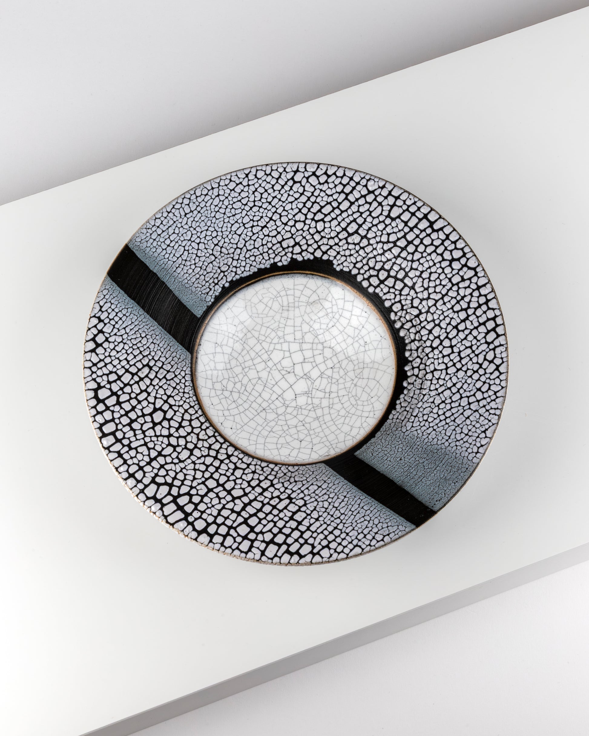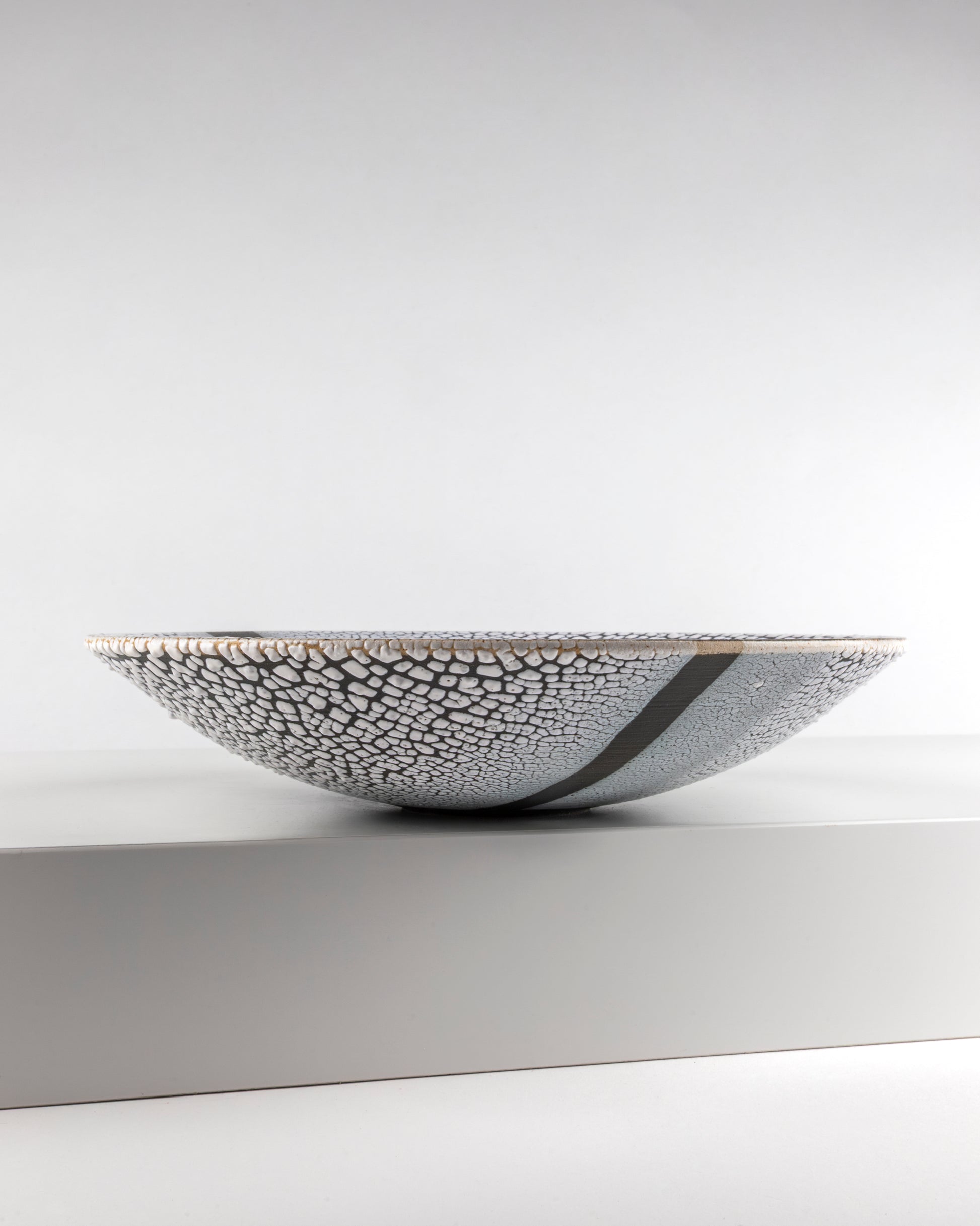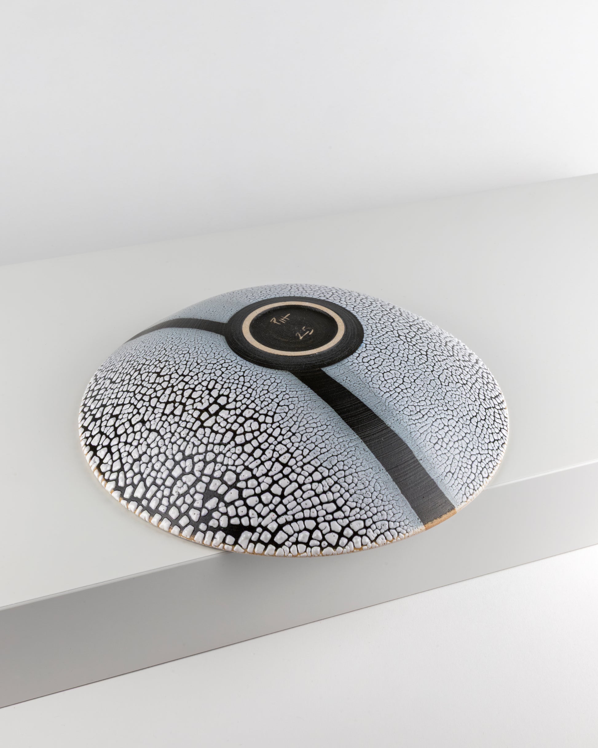 Thrown weighted stoneware Crucible with layered glazes and decorative slips inspired by the Winter Northumbrian coastline.