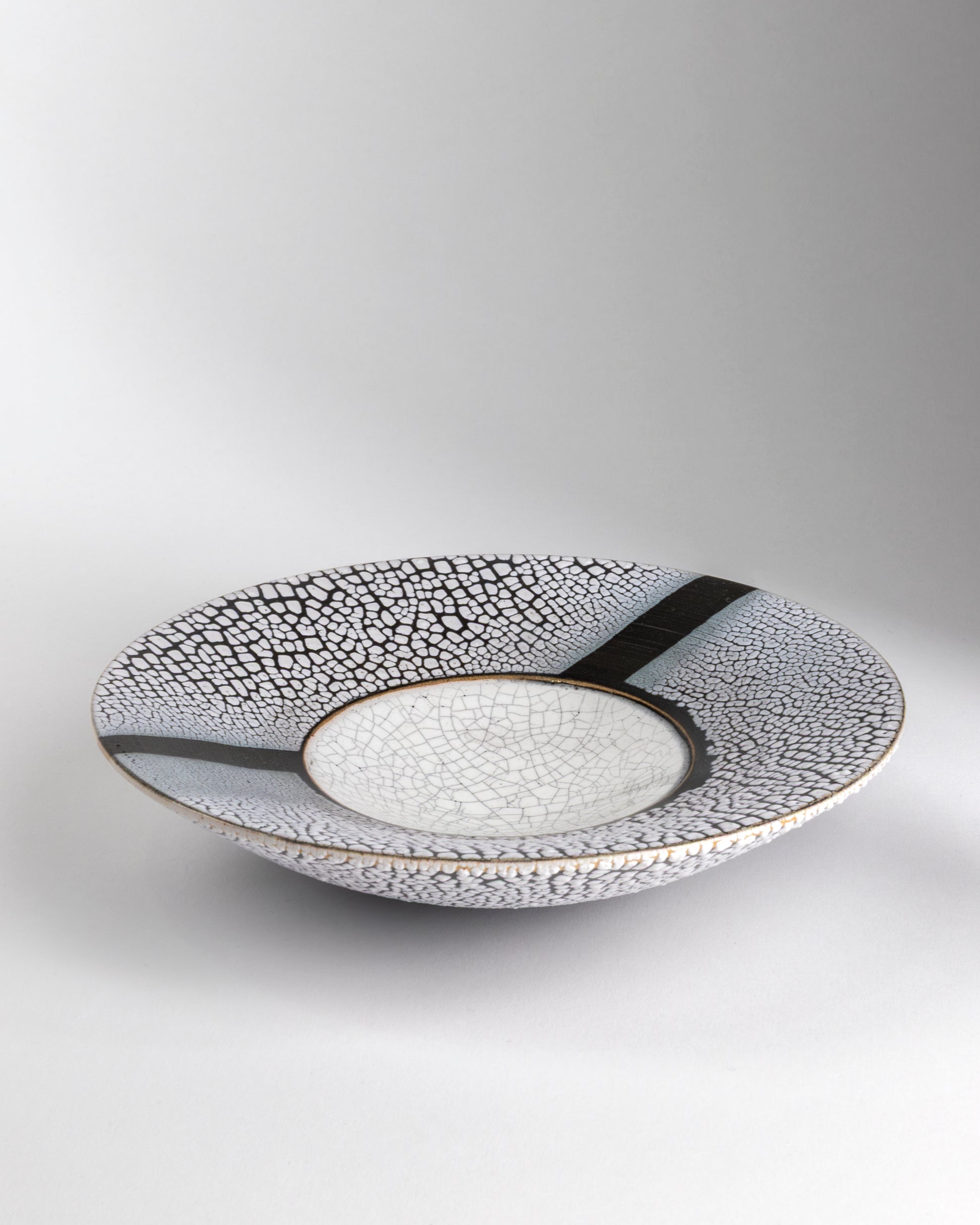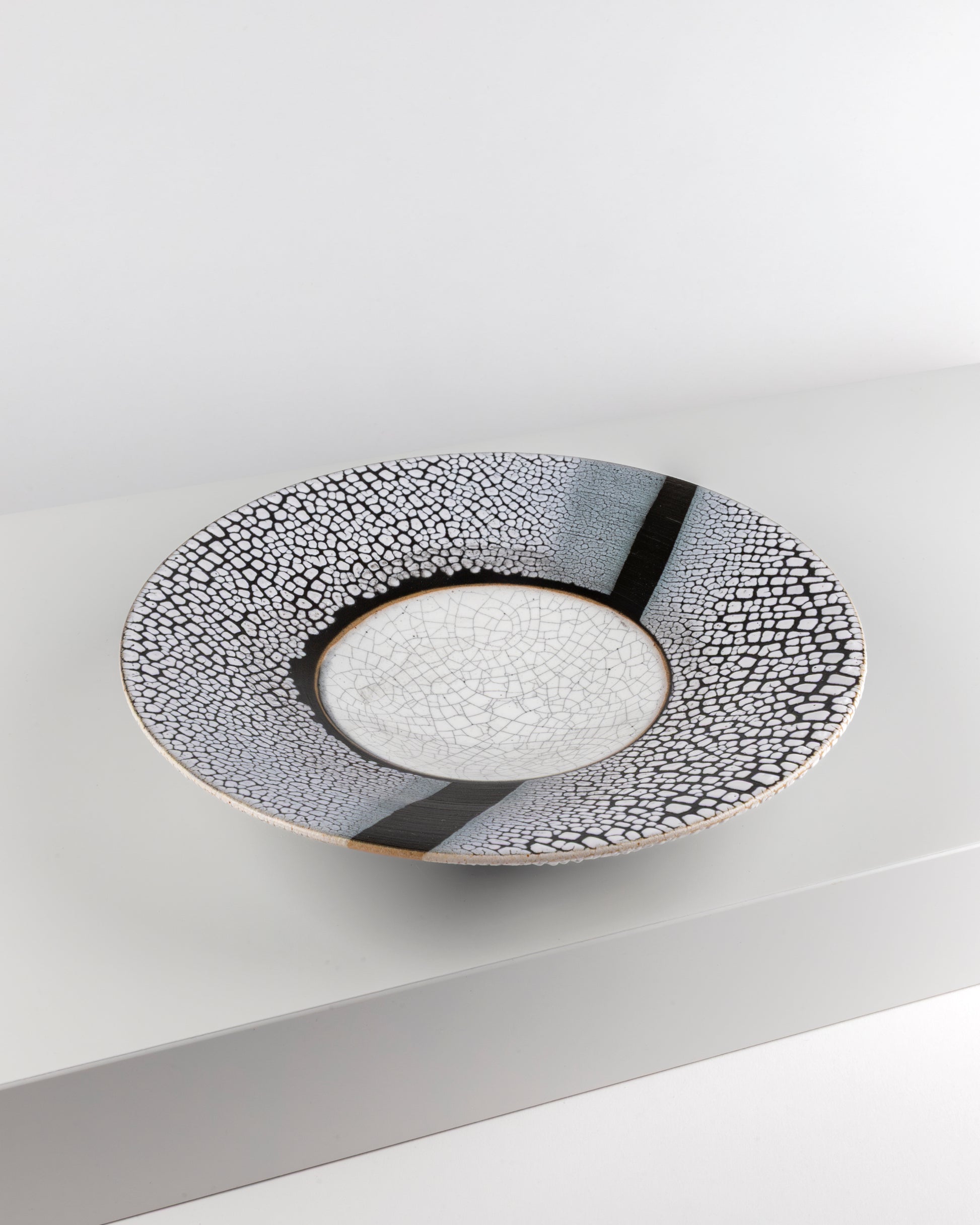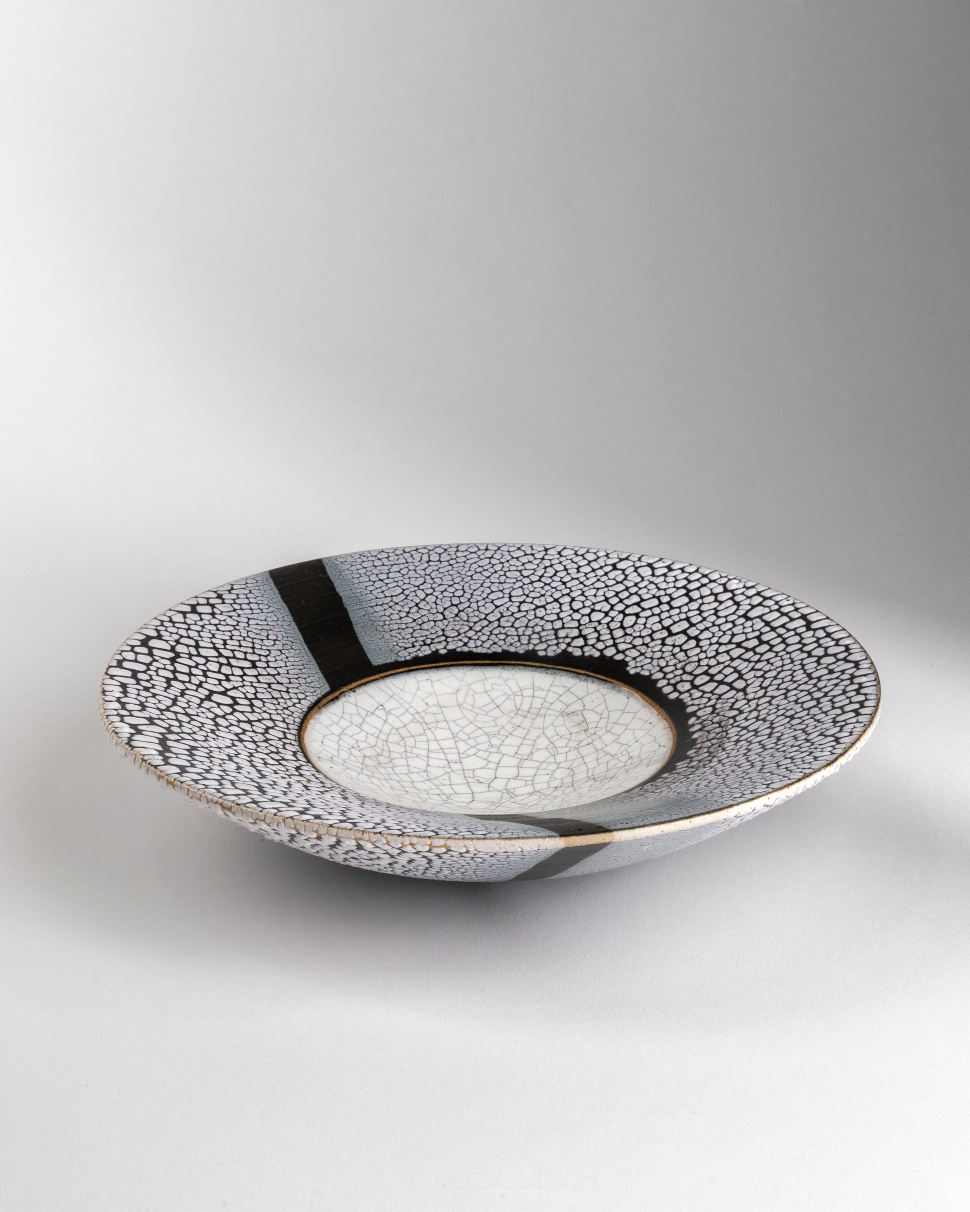 Thrown weighted stoneware Crucible with layered glazes and decorative slips inspired by the Winter Northumbrian coastline.