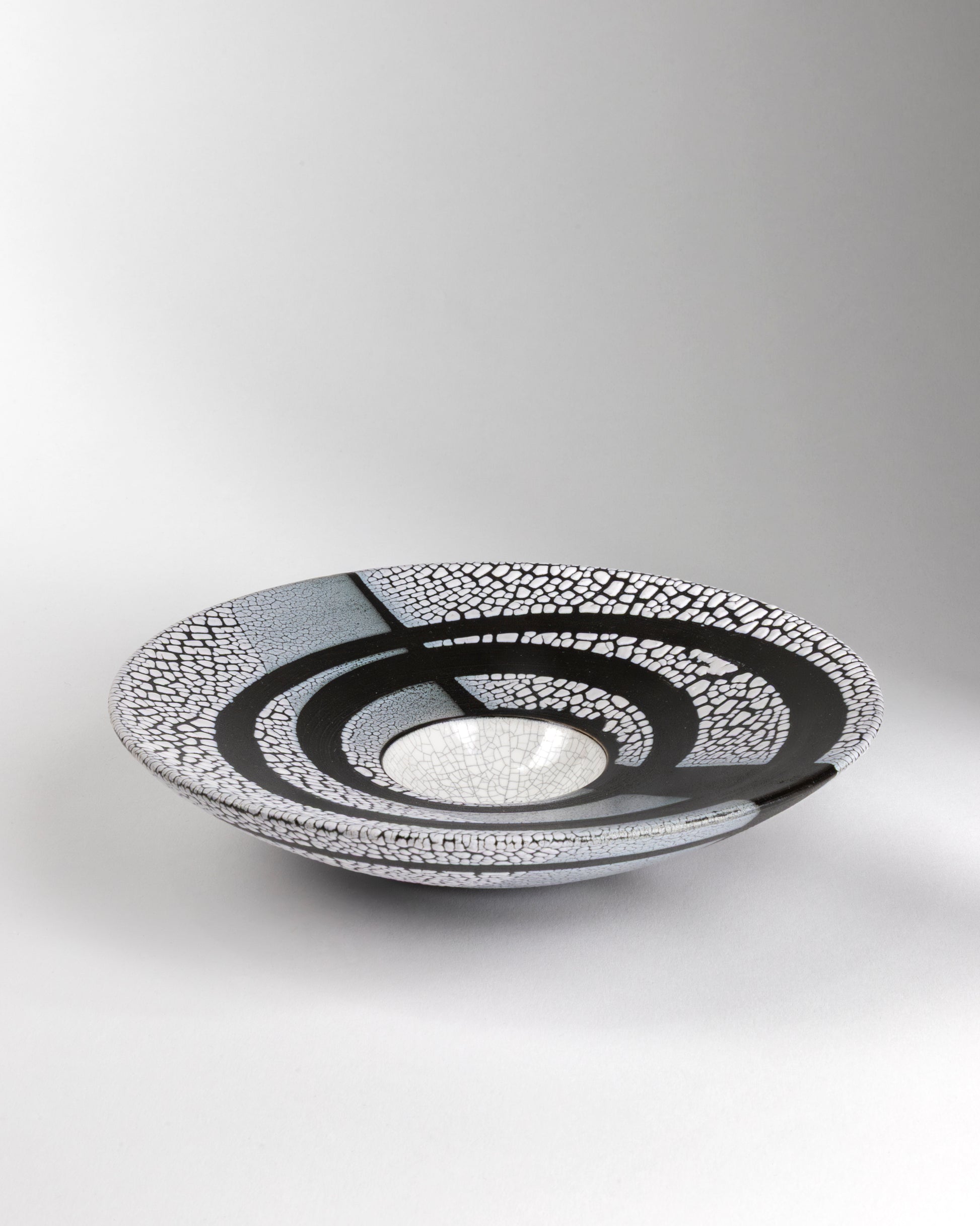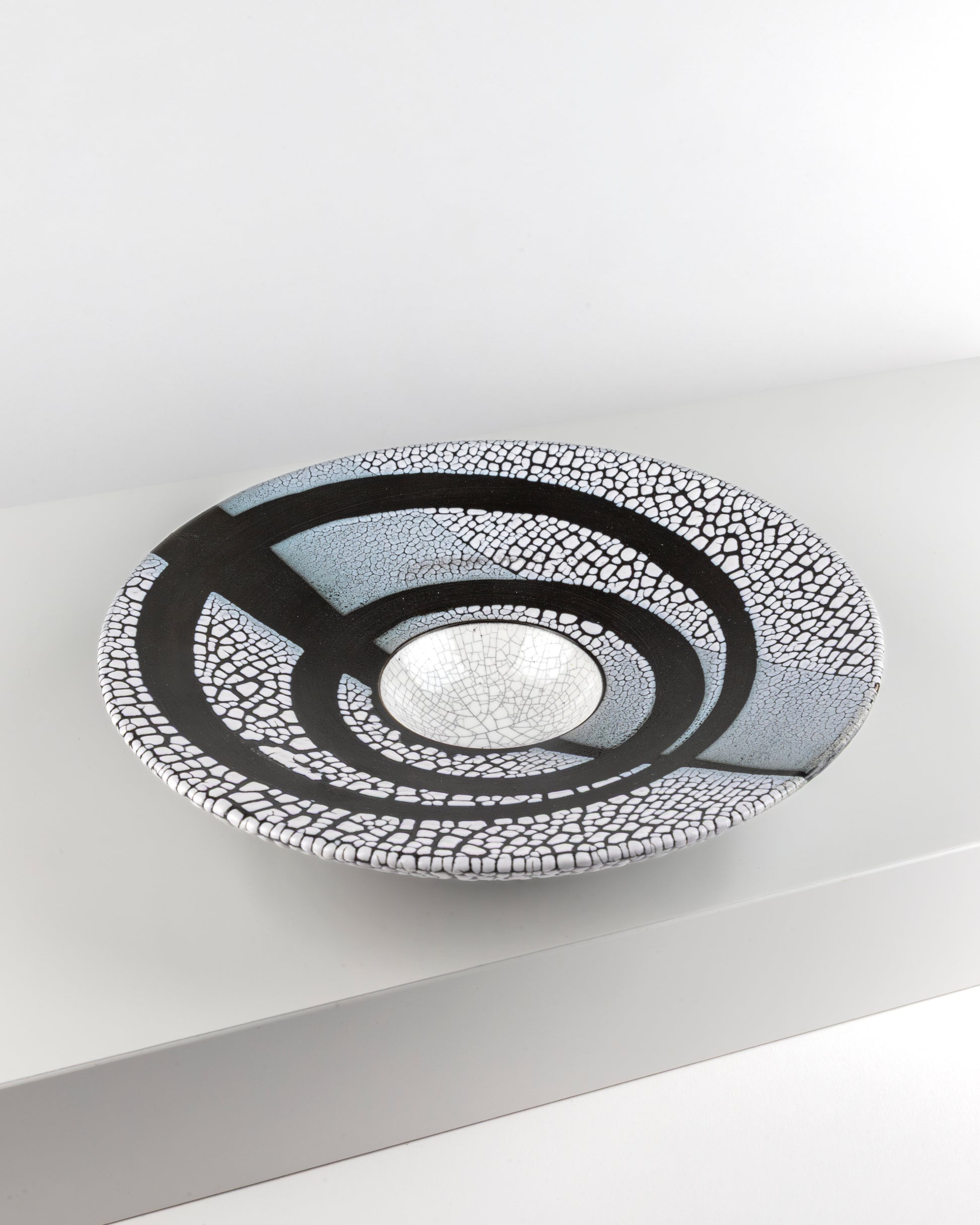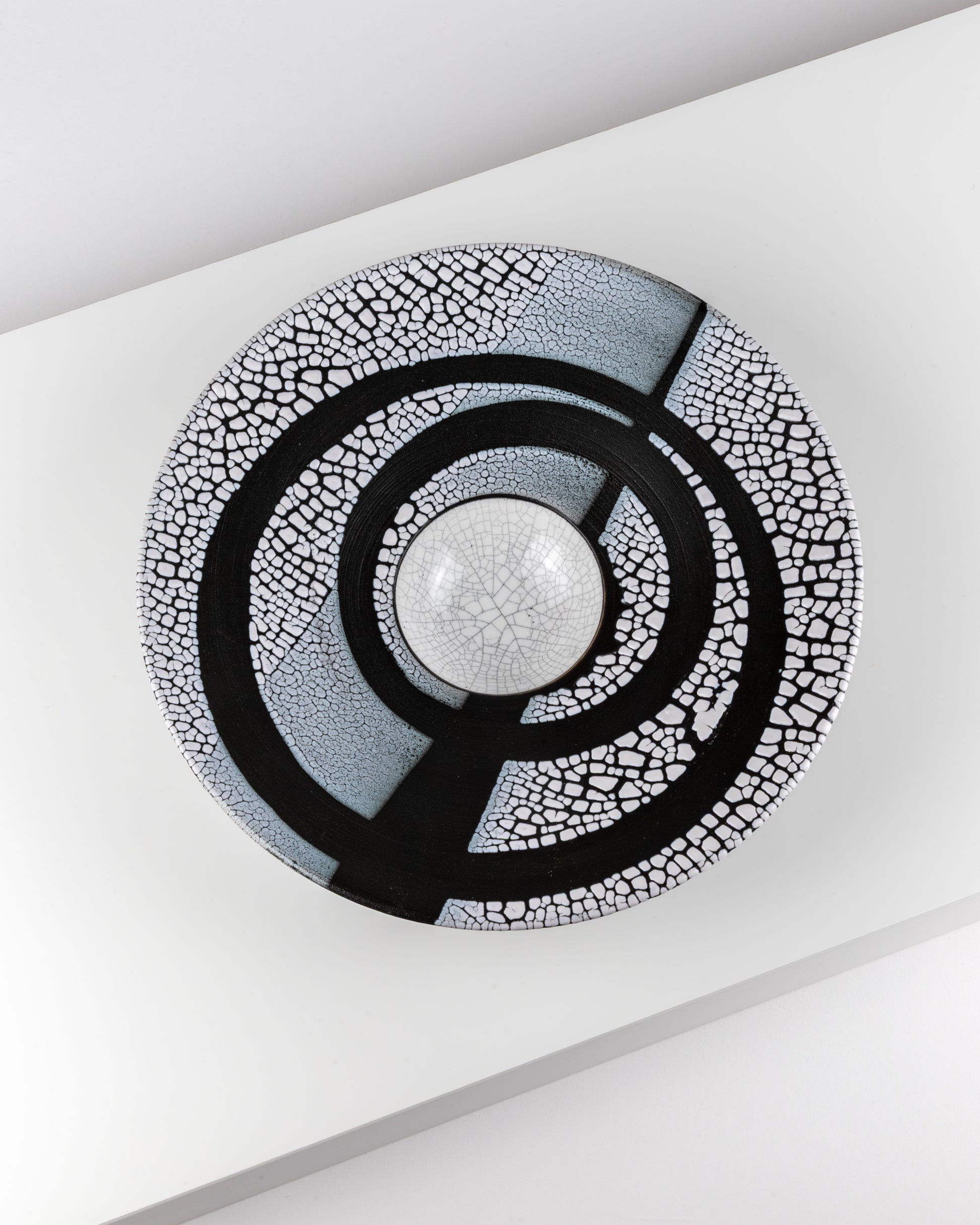 Thrown weighted stoneware Crucible with layered glazes and decorative slips inspired by the Winter Northumbrian coastline.