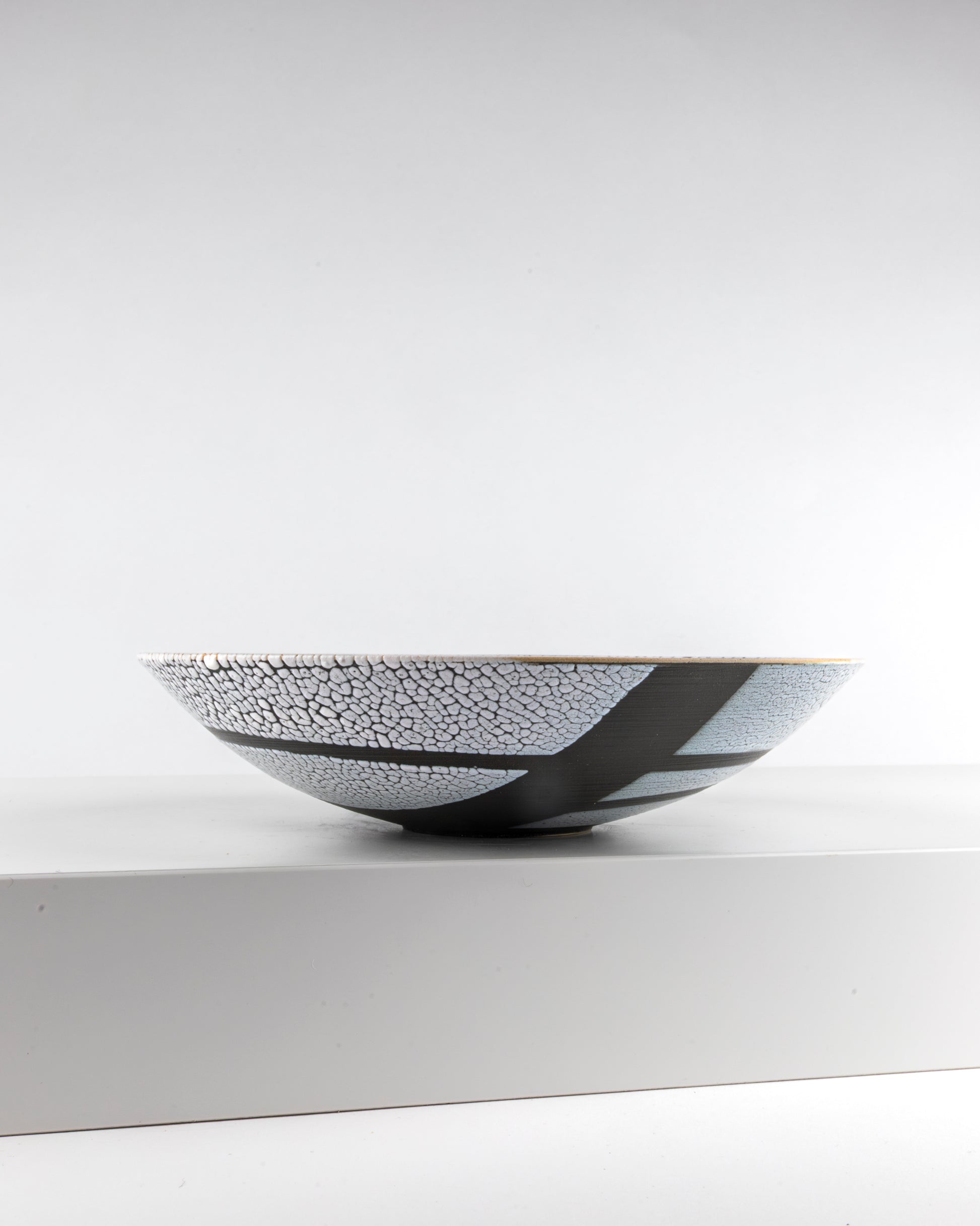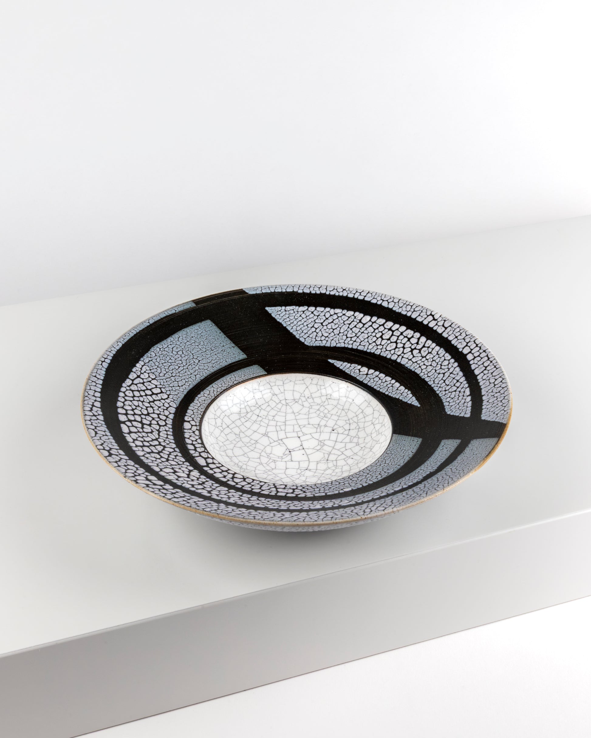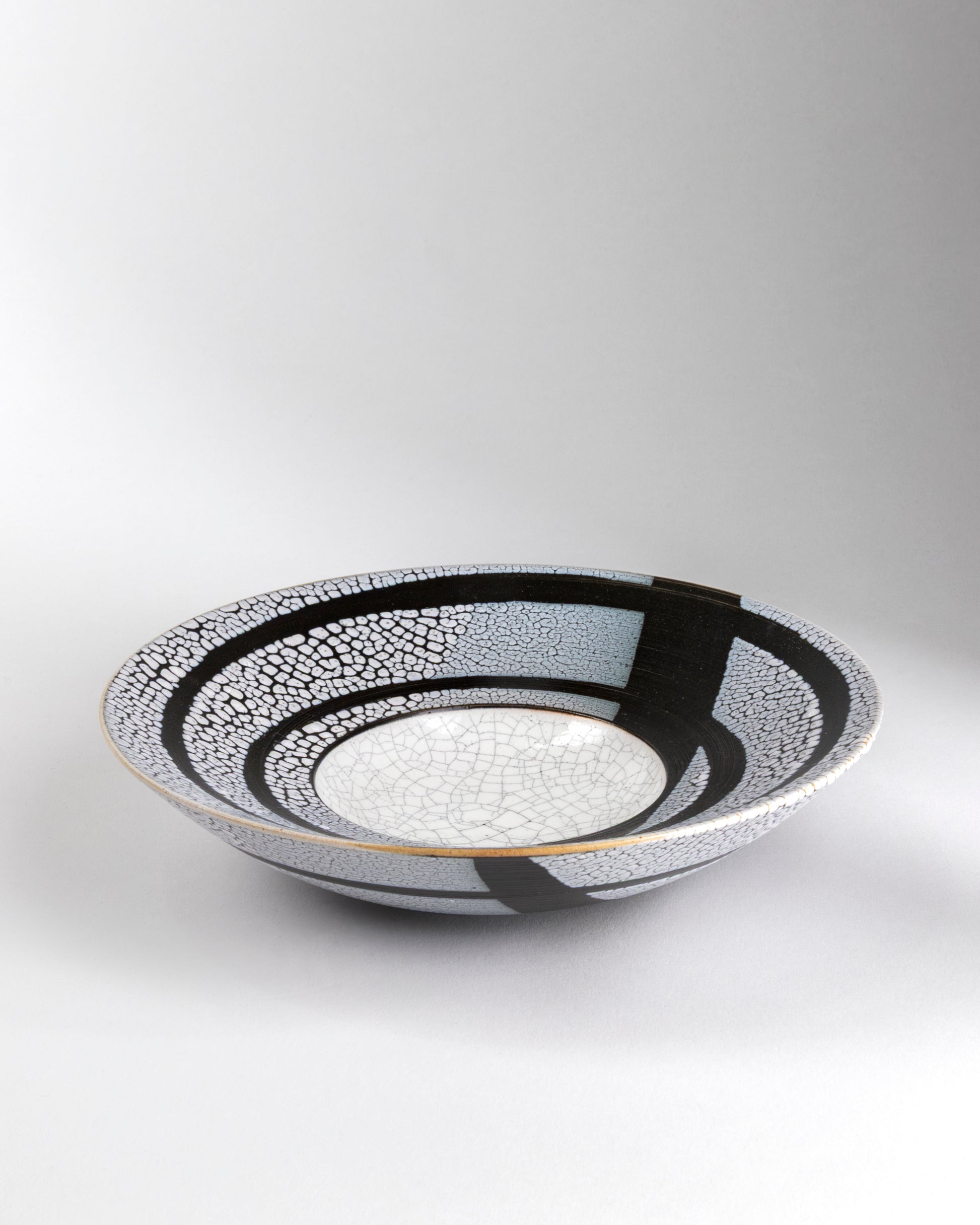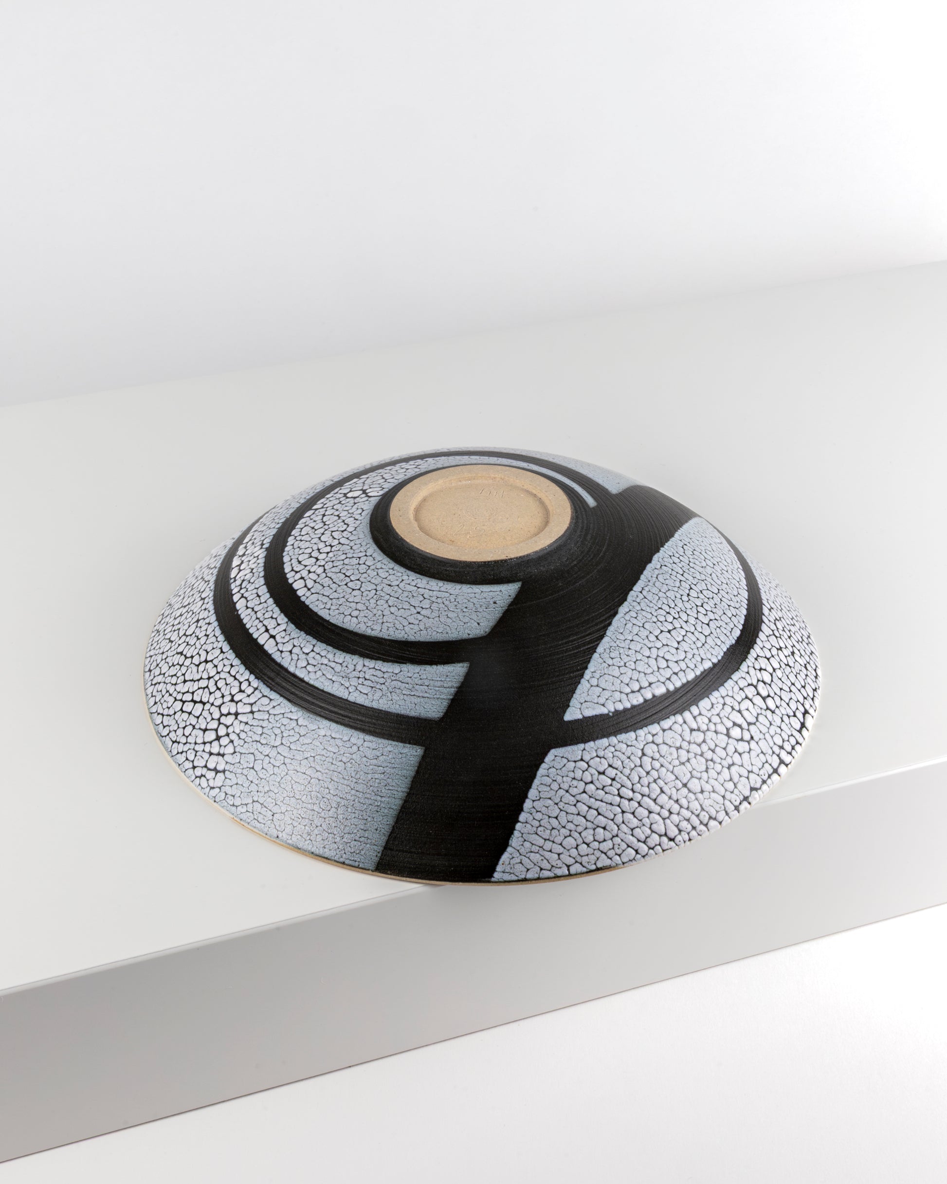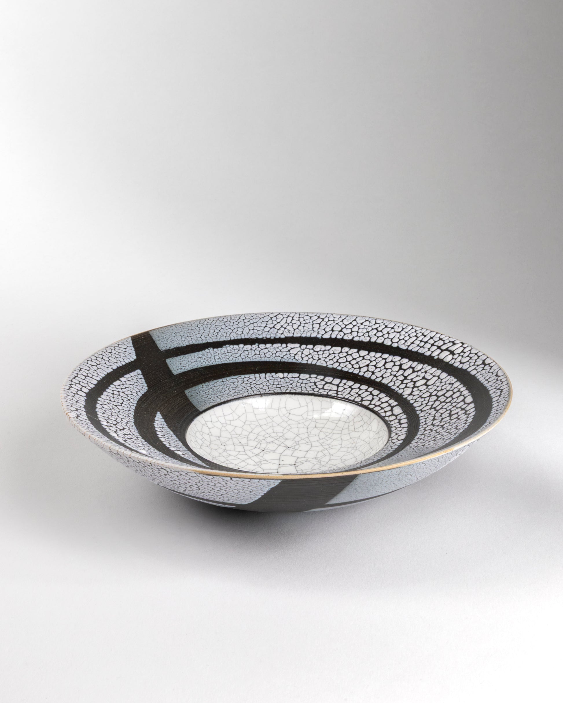 Thrown weighted stoneware Crucible with layered glazes and decorative slips inspired by the Winter Northumbrian coastline.