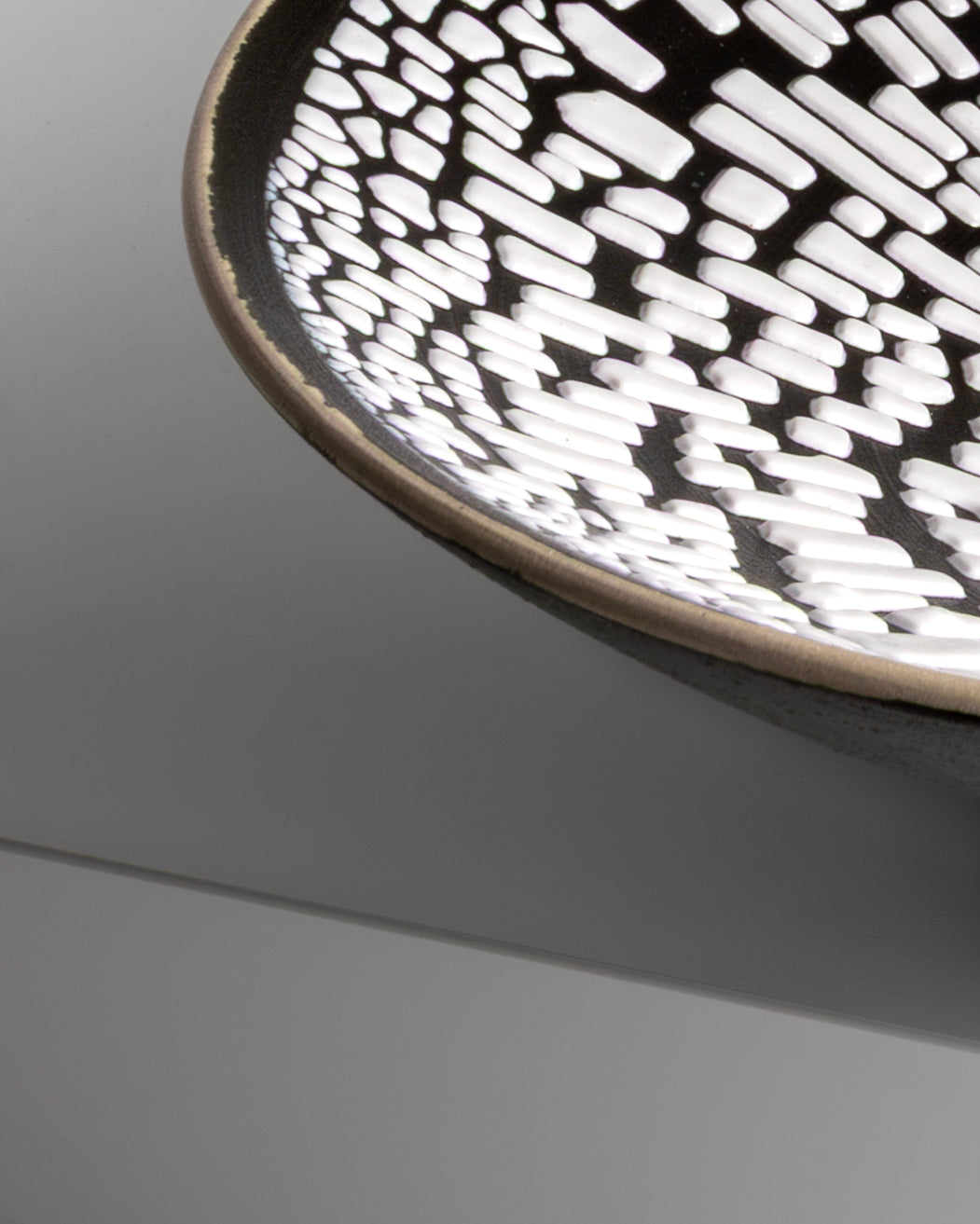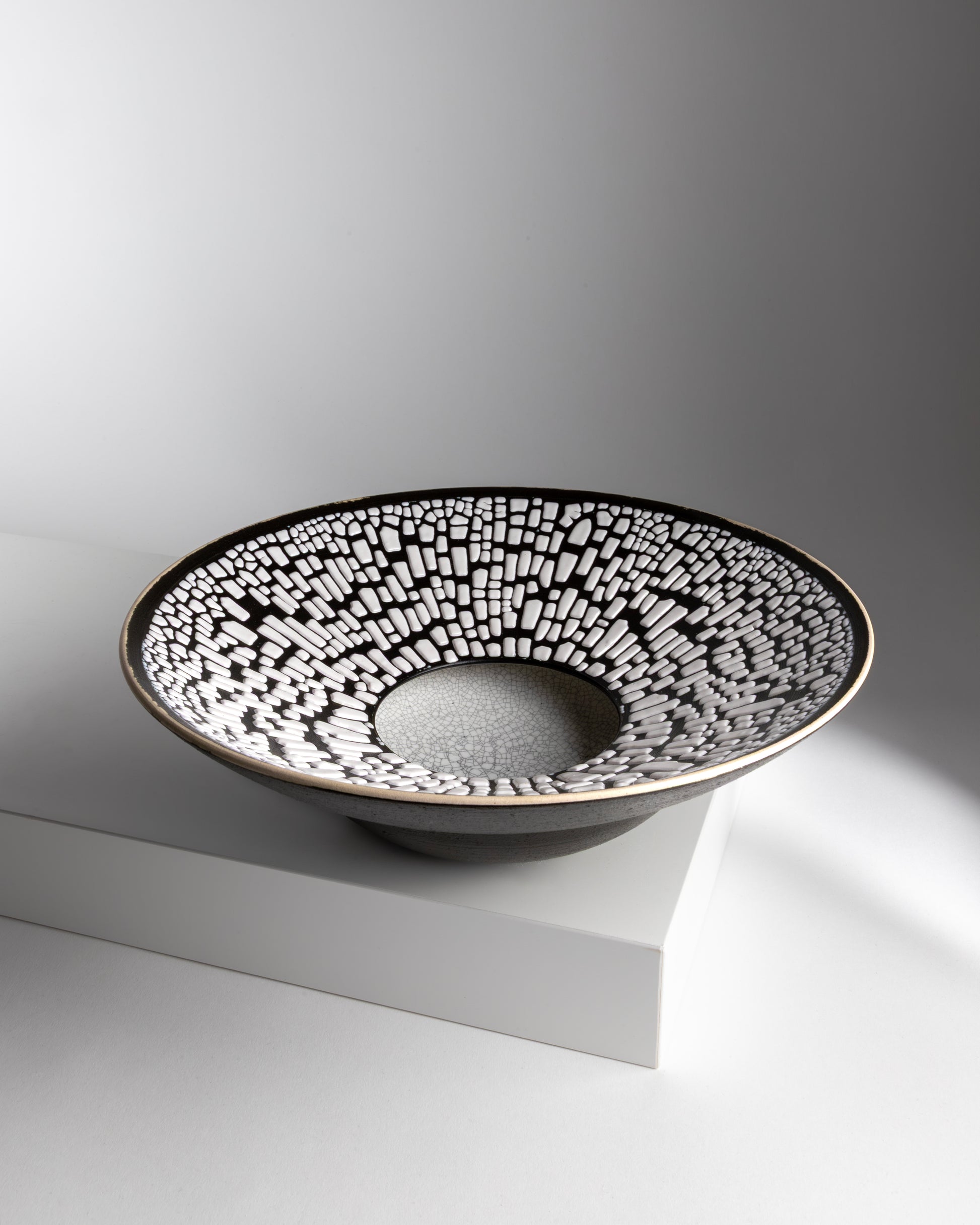 Large elegant thrown bowl thrown in 2 sections, turned, joined and turned to the final form. A thin black decorative slip has been applied to the outer surface providing a striking silhouette in profile. The terraced double internal bowl features a Kuan crackle glaze in the lower volume, complimented by a heavy crawling glaze on the upper surface. The rim is hand eroded to reveal the underlying off-white stoneware clay. The piece is signed and dated on the base.