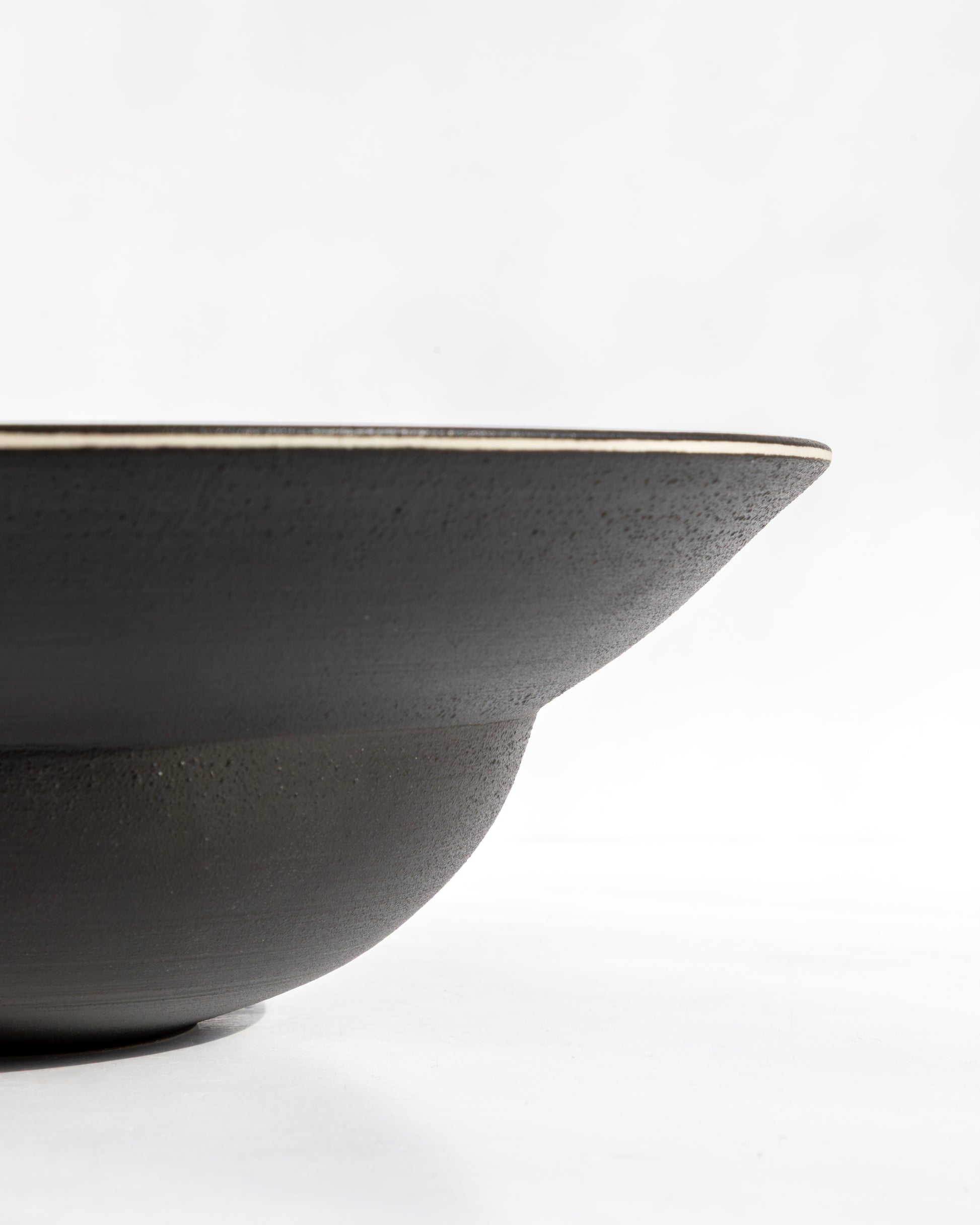 This elegant thrown stoneware Iris Bowl comprises of a distinctive double bowl form and features a wide sweeping concave rim with an inner bowl form. The eye is drawn inward to the central inked Kuan crazing glaze surface by way of organic spoked patterning characteristic of the white crawling glaze applied to the wide rim.