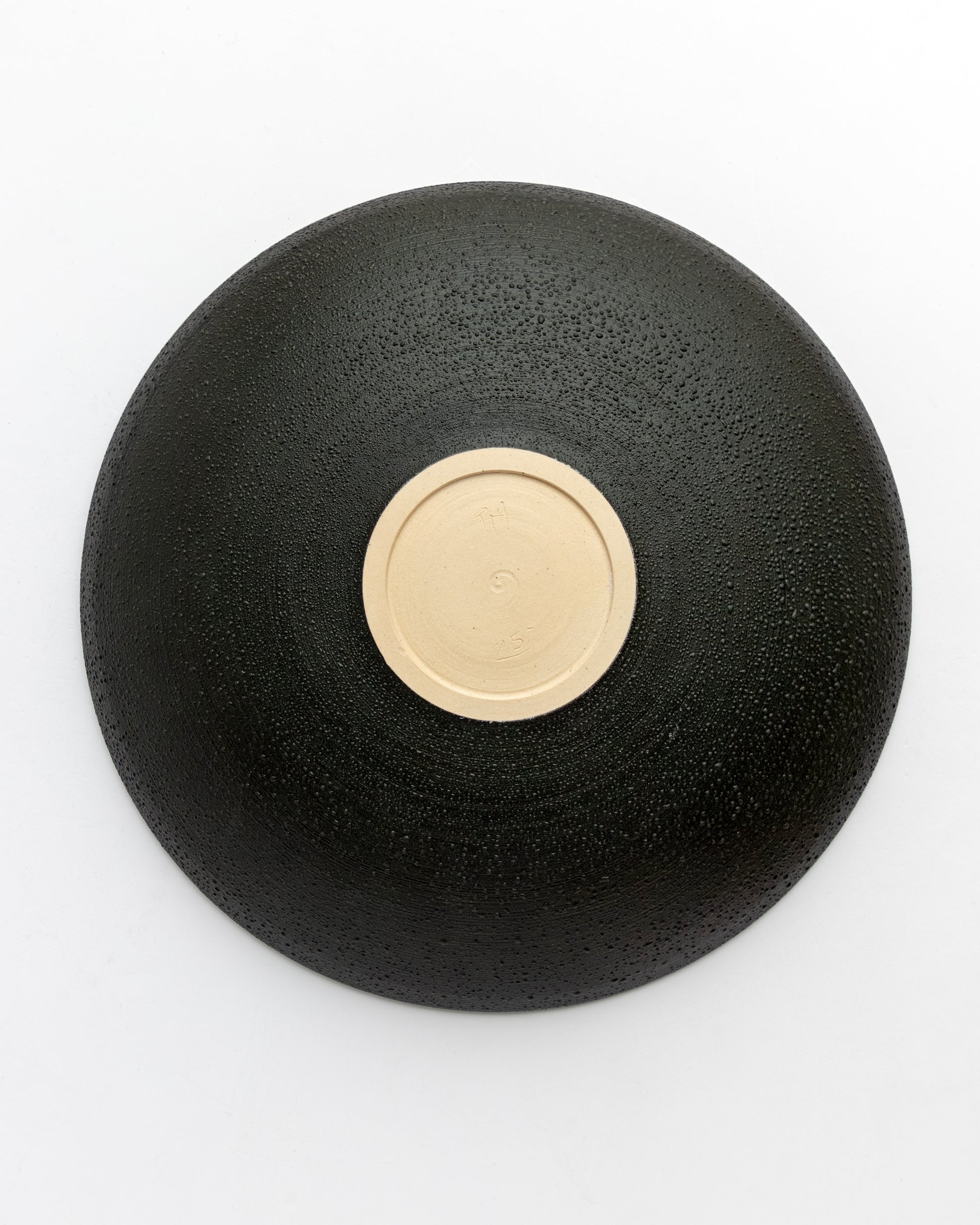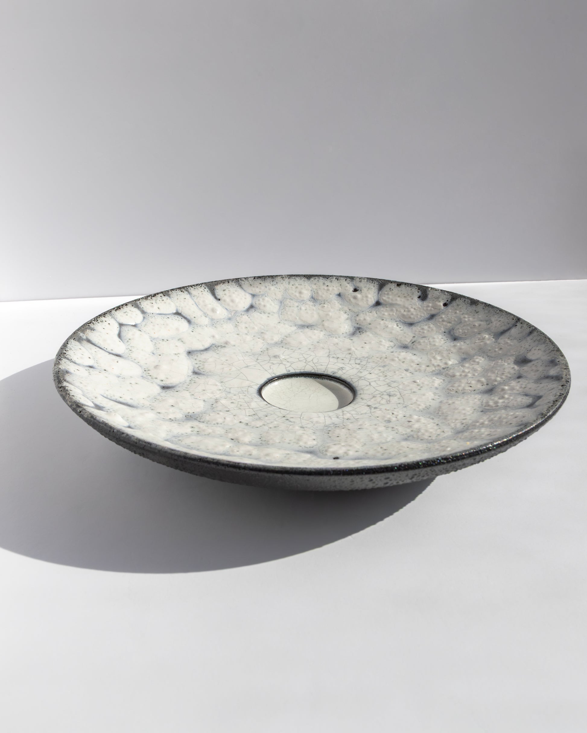 This thrown stoneware form draws inspiration from lunar topography and lunar cycles, presenting a refined composition of contrasting surfaces. The shallow form features a concentrated central volume finished with a light Kuan crazing glaze. The outer surround showcases the maker's unique glaze combination, establishing a sophisticated dialogue between the two distinct zones. the reverse of the piece features a lightly textured satin black slip surface. A contemplative piece that merges celestial aesthetics with ceramic craftsmanship.