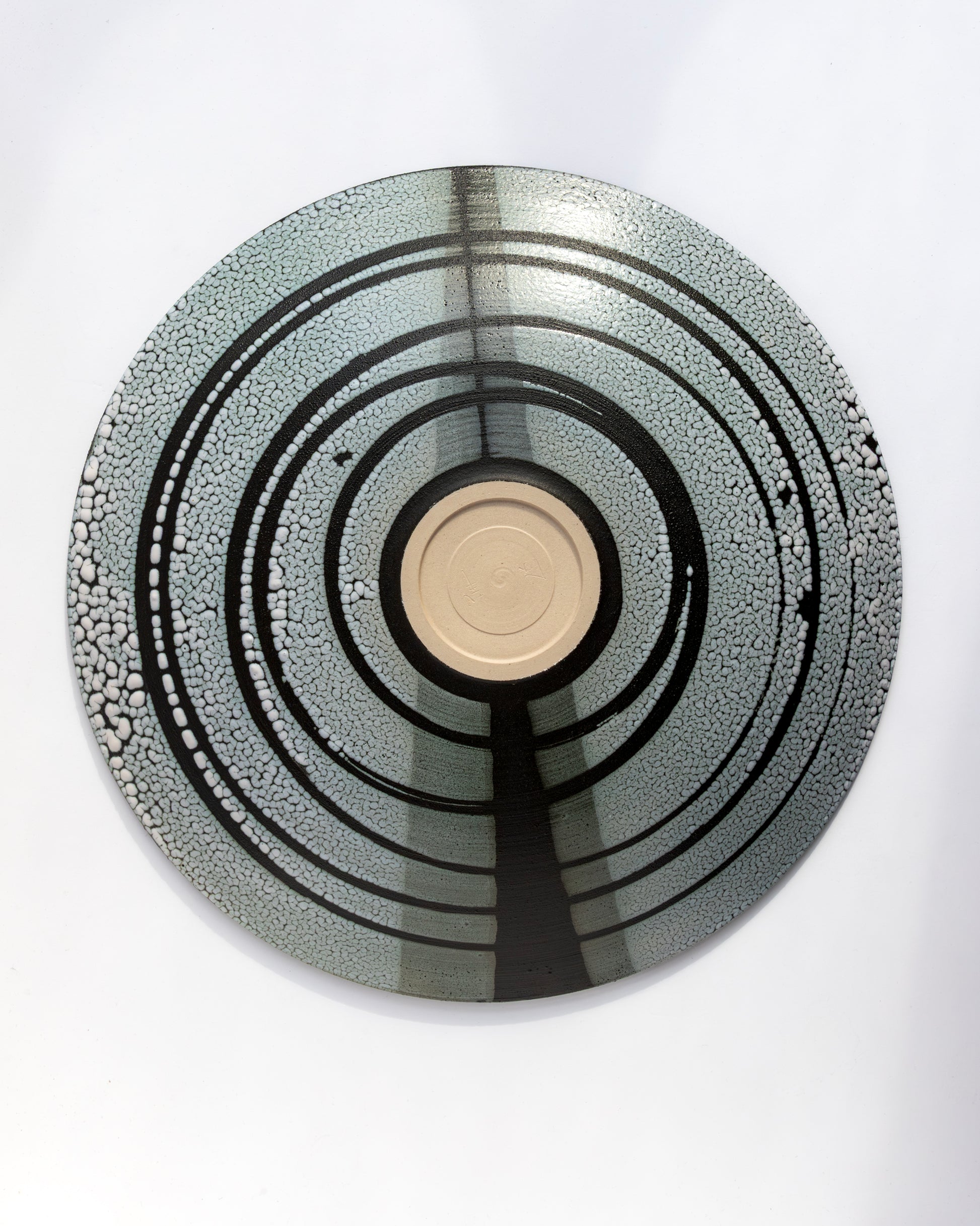 A large, weighty hand-thrown stoneware Charger with an Op-Art design. The upper and lower surfaces feature a black slip foundation underlying an organically textured crawling glaze surface, interrupted by precisely positioned wax-resist offset concentric rings that reference the lunar cycle.
