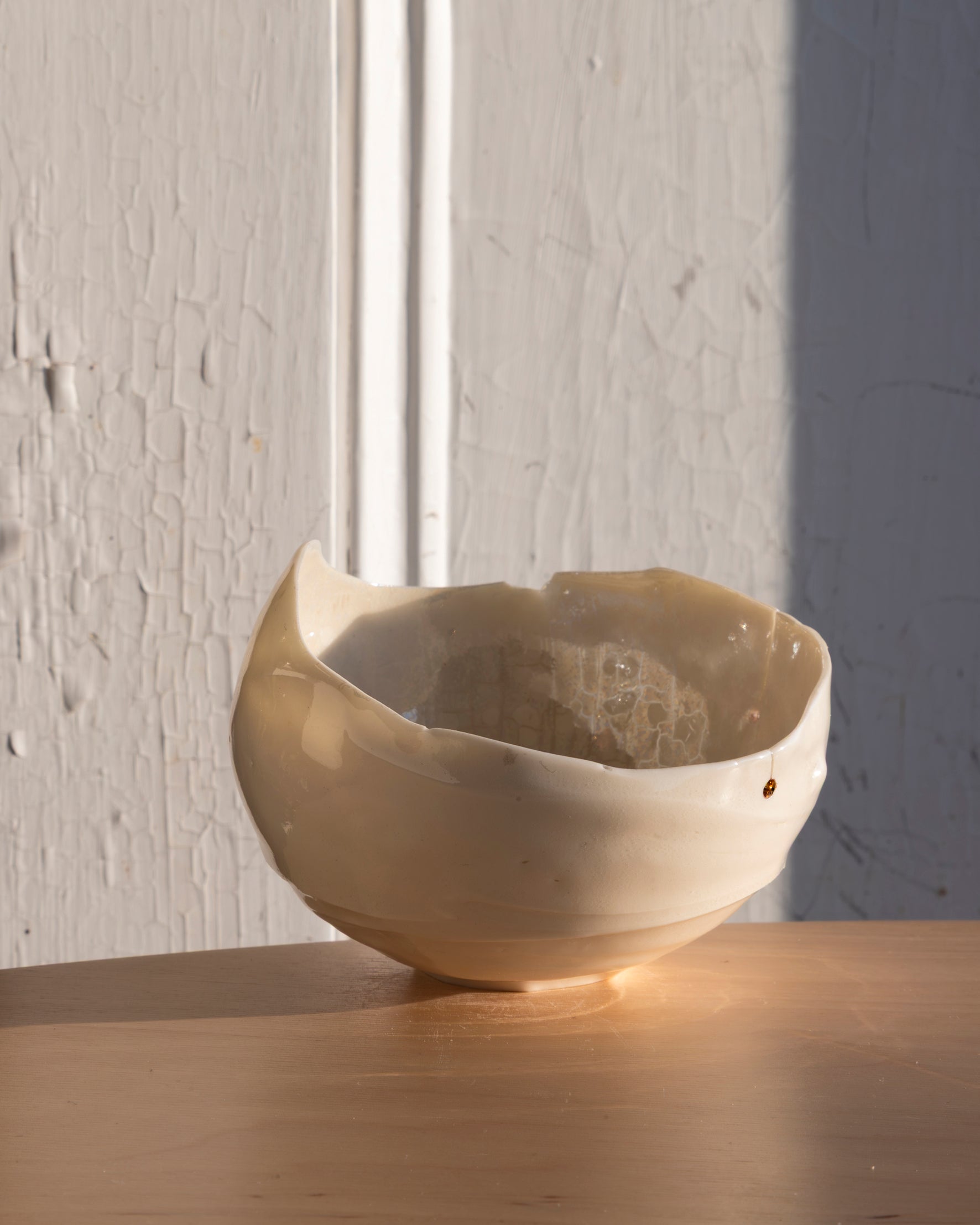 Delicate, organic, handcrafted porcelain Glimmer bowls feature an exquisite internal glaze that echoes the luminous quality of light dancing across water. Externally glazed with a transparent and selectively crazing glaze, the additional application of gold lustre to pierced and fractured details adds highlights to this decorative piece. Each bowl is individually made, ensuring subtle variations and making each piece unique. Each Glimmer bowl arrives double-boxed and in an internal gift box to ensure safe transit.