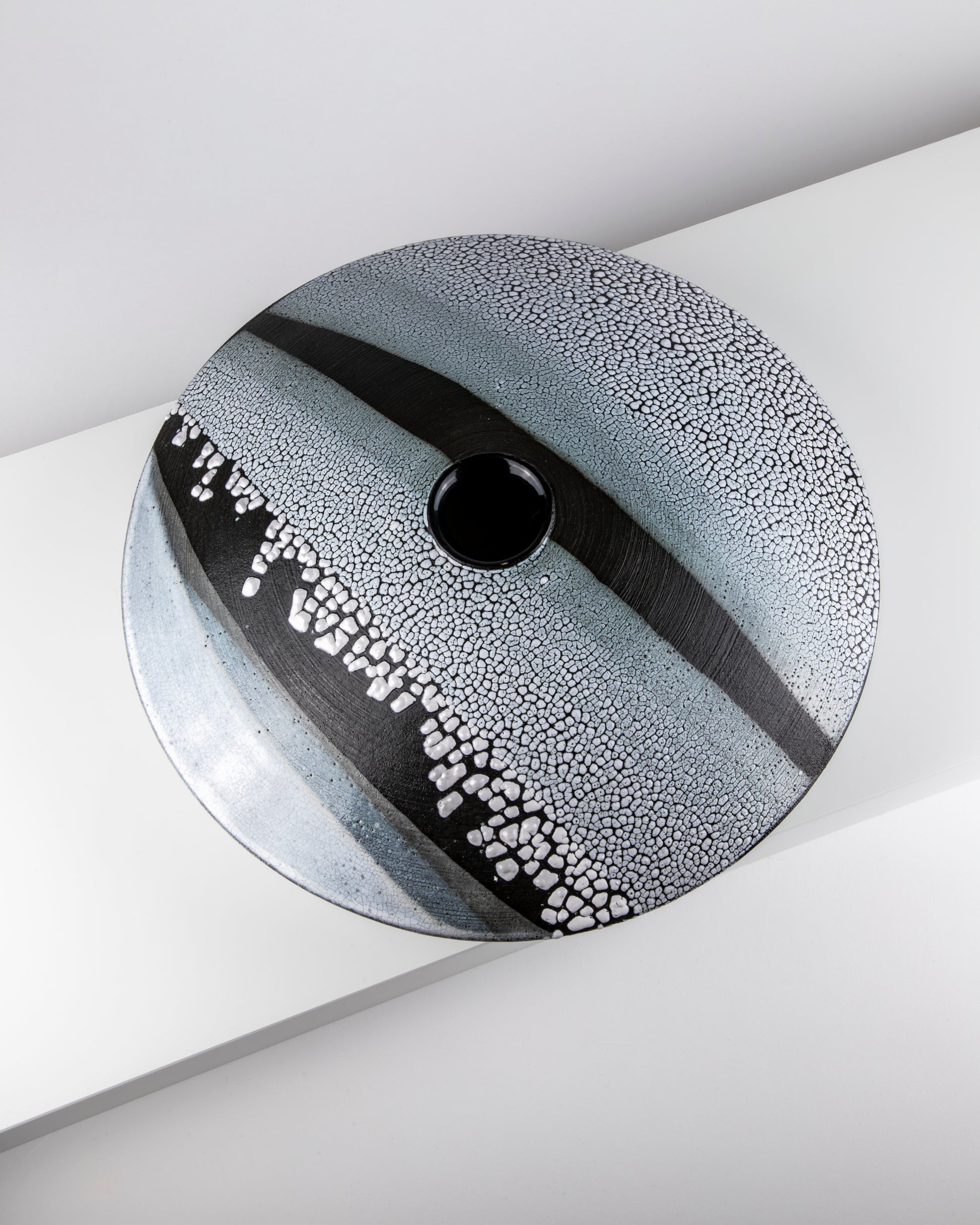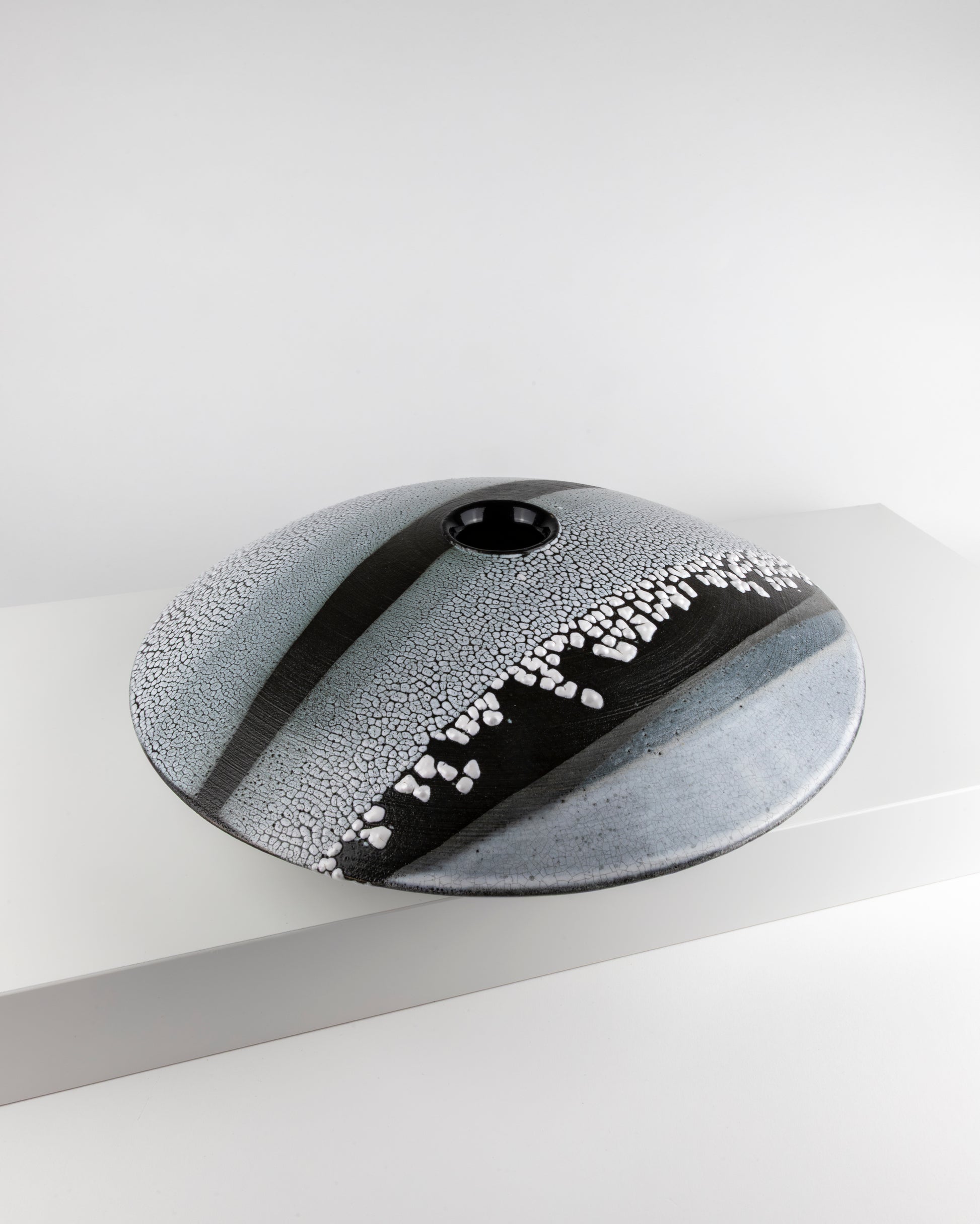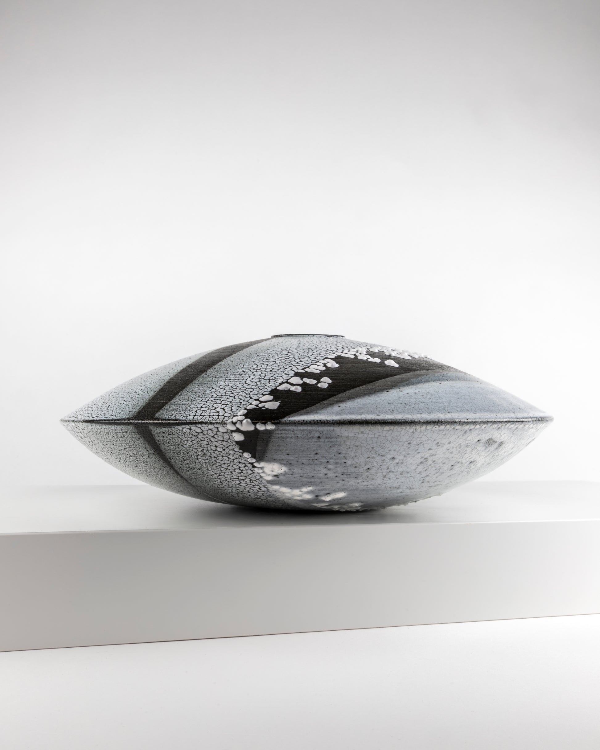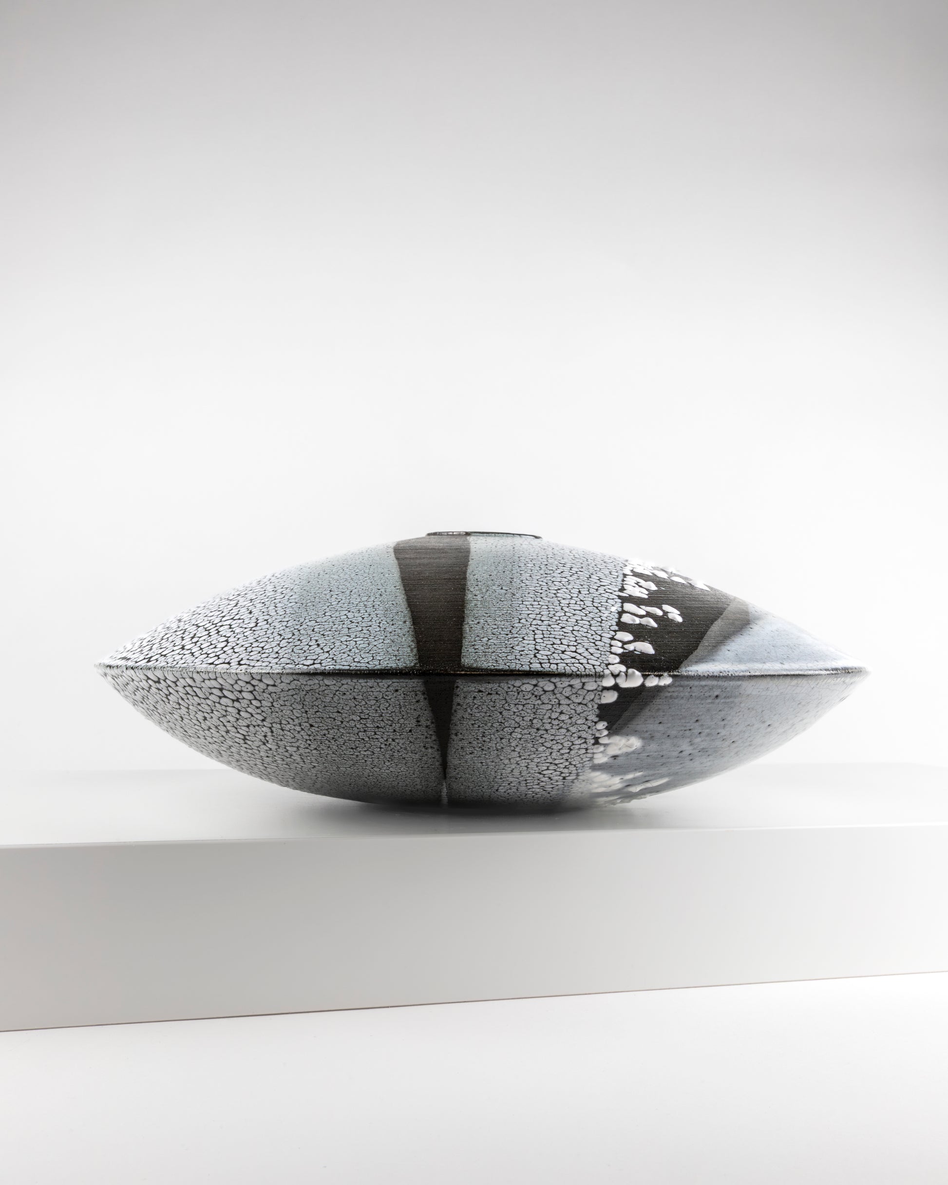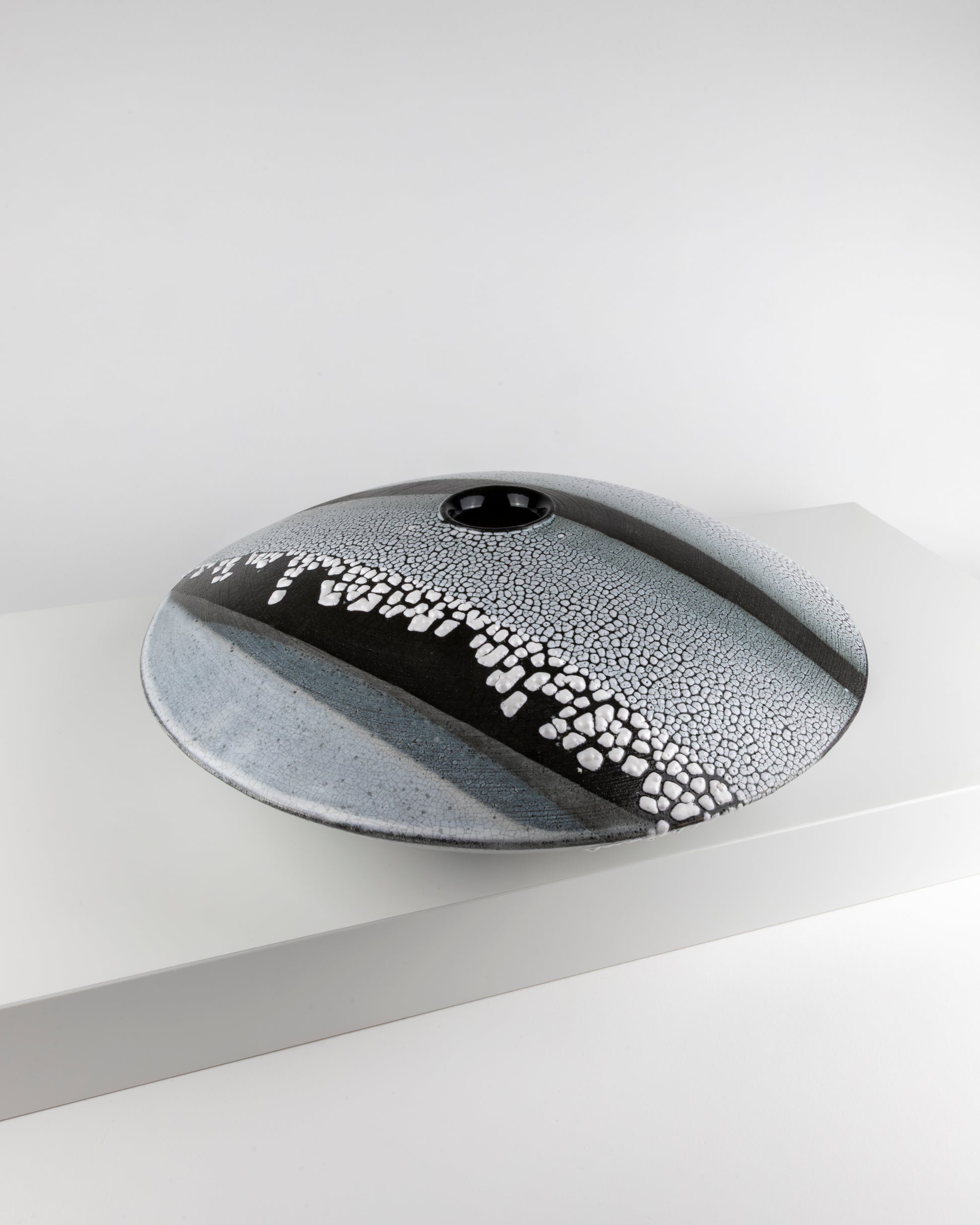 Large moulded and turned low profile vessel inspired by skimming stones with glazing reflecting the Northumbrian coastline.